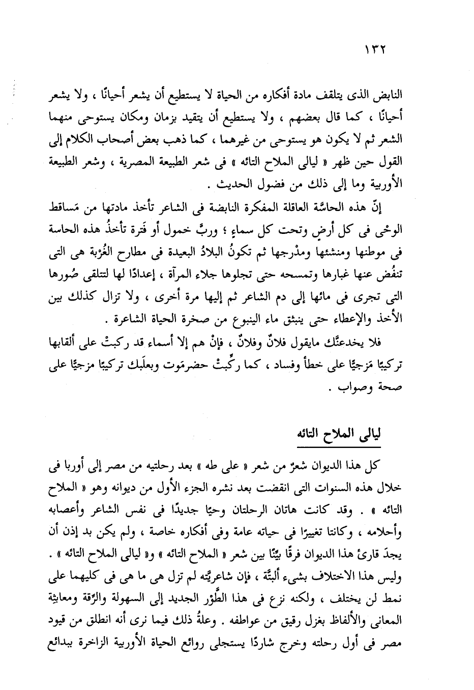 النابض الذي يتلقف مادة أفكاره من الحياة لا يستطيع أن يشعر أحيانًا، ولا يشعر أحيانًا، كما قال بعضهم، ولا يستطيع أن يتقيد بزمان ومكان يستوحي منهما الشعر ثم لا يكون هو يستوحي من غيرهما، كما ذهب بعض أصحاب الكلام الى القول حين ظهر "ليالي الملاح التائه" في شعر الطبيعة المصرية، وشعر الطبيعة الأوربية وما إلى ذلك من فضول الحديث.