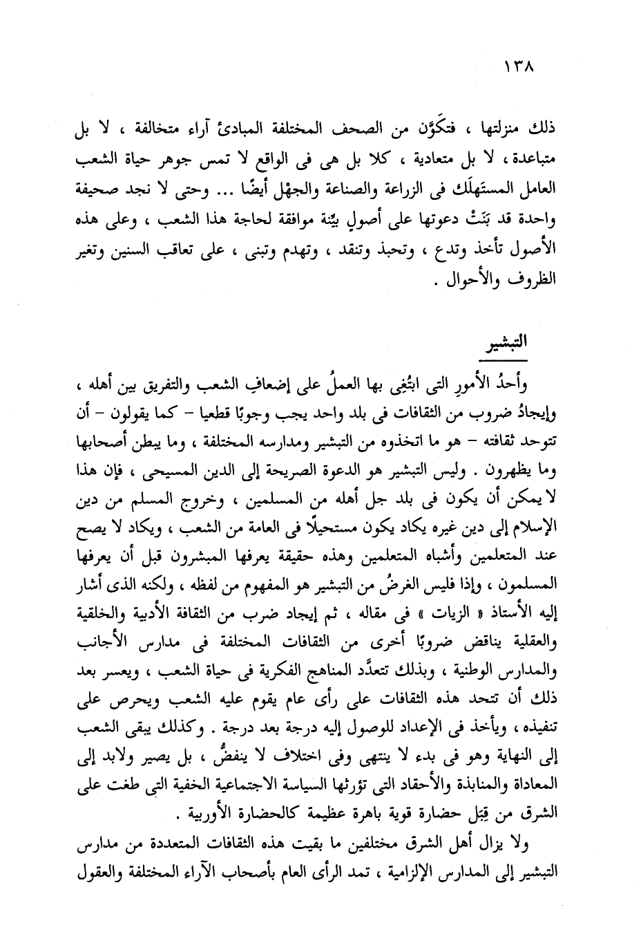 وأحدُ الأمورِ التي ابتُغِى بها العملُ على إضعافِ الشعب والتفريق بين أهله، وإيجادُ ضروب من الثقافات في بلد واحد يجب وجوبًا قطعيا -كما يقولون- أن تتوحد ثقافته -هو ما اتخذوه من التبشير ومدارسه المختلفة، وما يبطن أصحابها وما يظهرون. وليس التبشير هو الدعوة الصريحة إلى الدين المسيحي، فإن هذا لا يمكن أن يكون في بلد جل أهله من المسلمين، وخروج المسلم من دين الإسلام الى دين غيره يكاد يكون مستحيلًا في العامة من الشعب، ويكاد لا يصح عند المتعلمين وأشباه المتعلمين وهذه حقيقة يعرفها المبشرون قبل أن يعرفها المسلمون، وإذا فليس الغرضُ من التبشير هو المفهوم من لفظه، ولكنه الذي أشار إليه الأستاذ "الزيات" في مقاله، ثم إيجاد ضرب من الثقافة الأدبية والخلقية والعقلية يناقض ضروبًا أخرى من الثقافات المختلفة في مدارس الأجانب والمدارس الوطنية، وبذلك تتعدَّد المناهج الفكرية في حياة الشعب، ويعسر بعد ذلك أن تتحد هذه الثقافات على رأي عام يقوم عليه الشعب ويحرص على تنفيذه، ويأخذ في الإعداد للوصول إليه درجة بعد درجة. وكذلك يبقى الشعب إلى النهاية وهو في بدء لا ينتهي وفي اختلاف لا ينفضُّ، بل يصير ولابد إلى المعاداة والمنابذة والأحقاد التي تؤرثها السياسة الاجتماعية الخفية التي طغت على الشرق من قِبَل حضارة قوية باهرة عظيمة كالحضارة الأوربية.