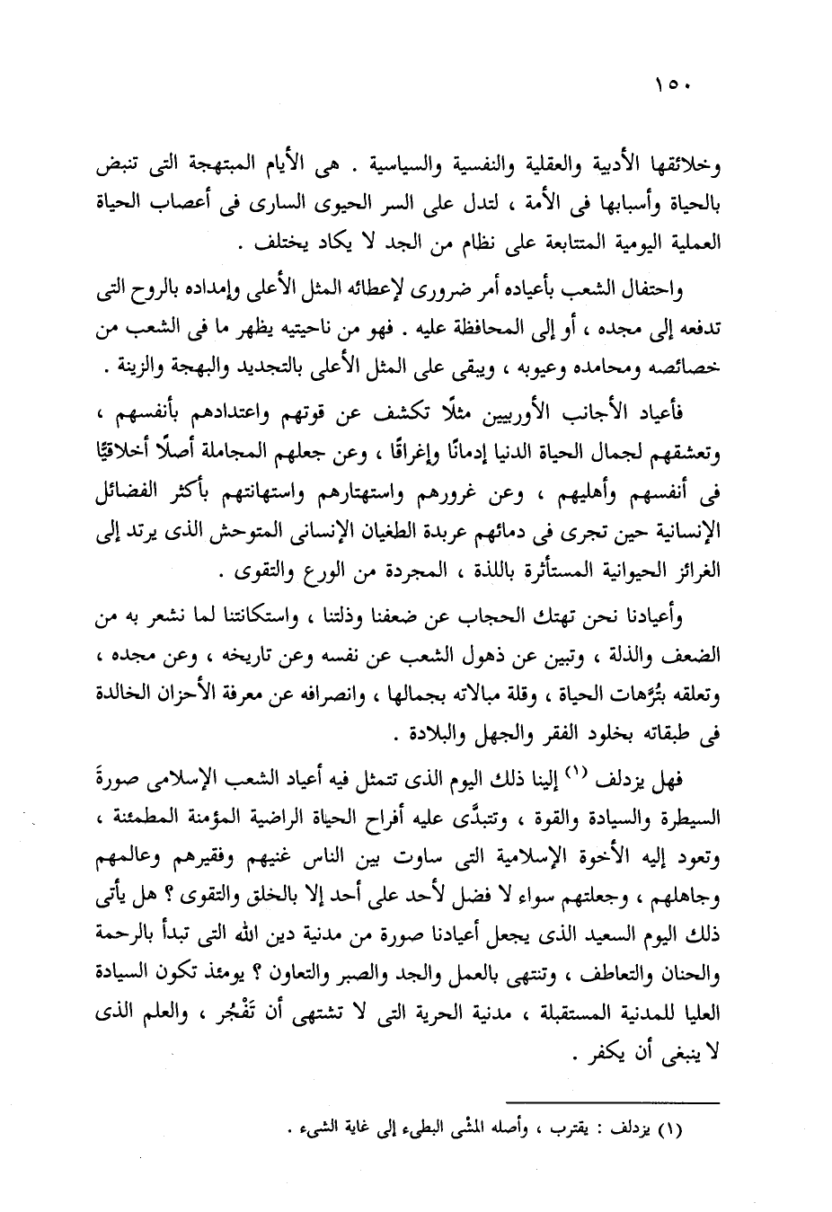 فهل يزدلف (¬1) إلينا ذلك اليوم الذي تتمثل فيه أعياد الشعب الإسلامي صورةَ السيطرة والسيادة والقوة، وتتبدَّى عليه أفراح الحياة الراضية المؤمنة المطمئنة، وتعود إليه الأخوة الإسلامية التي ساوت بين الناس غنيهم وفقيرهم وعالمهم وجاهلهم، وجعلتهم سواء لا فضل لأحد على أحد إلا بالخلق والتقوى؟ هل يأتي ذلك اليوم السعيد الذي يجعل أعيادنا صورة من مدنية دين الله التي تبدأ بالرحمة والحنان والتعاطف، وتنتهي بالعمل والجد والصبر والتعاون؟ يومئذ تكون السيادة العليا للمدنية المستقبلة، مدنية الحرية التي لا تشتهي أن تَفْجُر، والعلم الذي لا ينبغي أن يكفر.