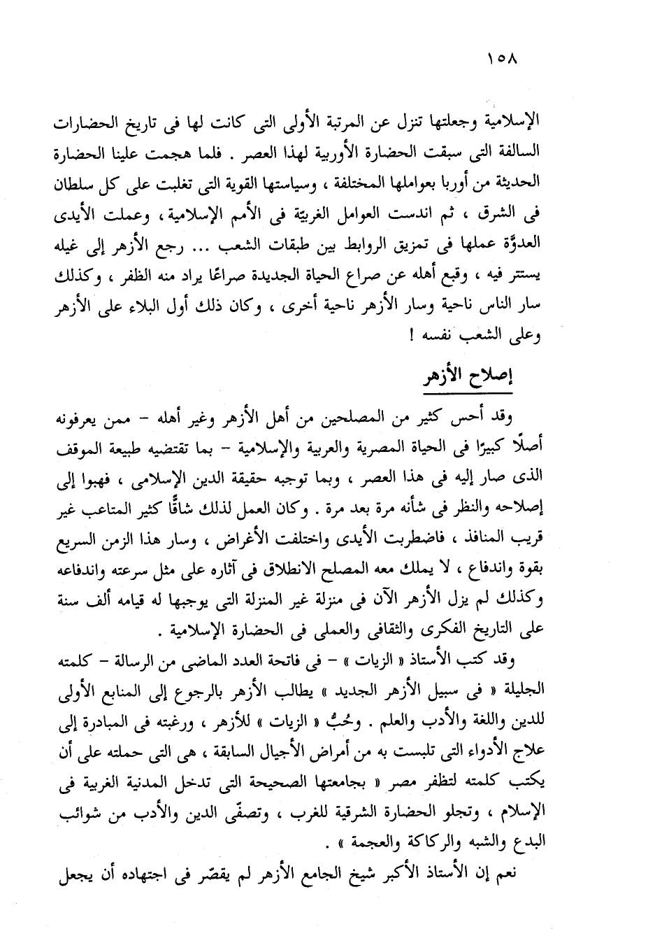 وقد أحس كثير من المصلحين من أهل الأزهر وغير أهله -ممن يعرفونه أصلًا كبيرًا في الحياة المصرية والعربية والإسلامية- بما تقتضيه طبيعة الموقف الذي صار إليه في هذا العصر، وبما توجبه حقيقة الدين الإسلامي، فهبوا إلى إصلاحه والنظر في شأنه مرة بعد مرة. وكان العمل لذلك شاقًّا كثير المتاعب غير قريب المنافذ، فاضطربت الأيدي واختلفت الأغراض، وسار هذا الزمن السريع بقوة واندفاع، لا يملك معه المصلح الانطلاق في آثاره على مثل سرعته واندفاعه وكذلك لم يزل الأزهر الآن في منزلة غير المنزلة التي يوجبها له قيامه ألف سنة على التاريخ الفكري والثقافي والعملي في الحضارة الإسلامية.