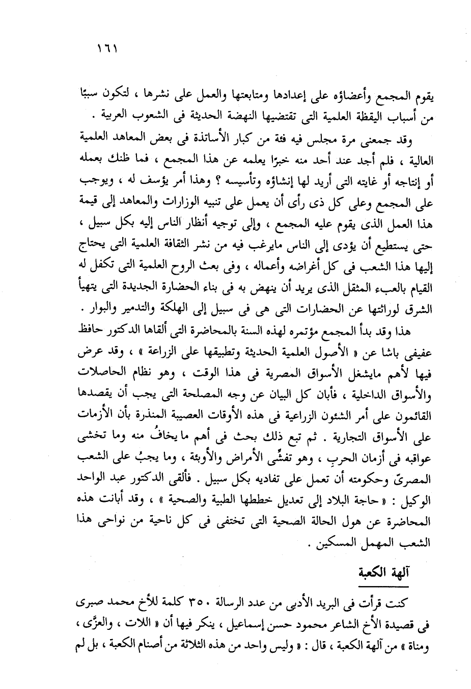 وقد جمعني مرة مجلس فيه فئة من كبار الأساتذة في بعض المعاهد العلمية العالية، فلم أجد عند أحد منه خبرًا يعلمه عن هذا المجمع، فما ظنك بعمله أو إنتاجه أو غايته التي أريد لها إنشاؤه وتأسيسه؟ وهذا أمر يؤسف له، ويوجب على المجمع وعلى كل ذي رأى أن يعمل على تنبيه الوزارات والمعاهد إلى قيمة هذا العمل الذي يقوم عليه المجمع، وإلى توجيه أنظار الناس إليه بكل سبيل، حتى يستطيع أن يؤدي إلى الناس ما يرغب فيه من نشر الثقافة العلمية التي يحتاج إليها هذا الشعب في كل أغراضه وأعماله، وفي بعث الروح العلمية التي تكفل له القيام بالعبء المثقل الذي يريد أن ينهض به في بناء الحضارة الجديدة التي يتهيأ الشرق لوراثتها عن الحضارات التي هي في سبيل إلى الهلكة والتدمير والبوار.
