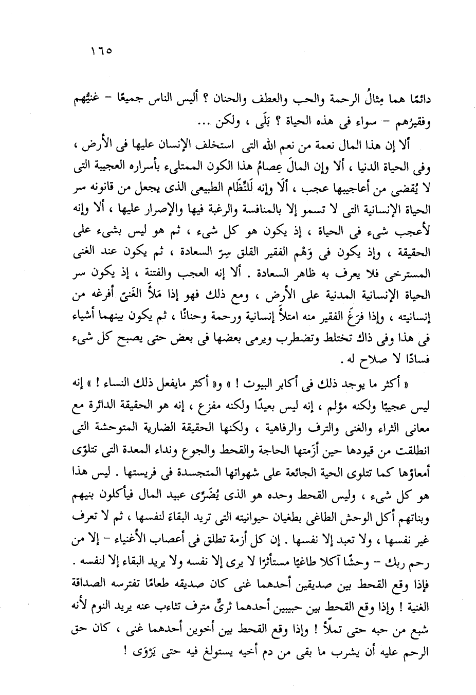 ألا إن هذا المال نعمة من نعم الله التي استخلف الإنسان عليها في الأرض، وفي الحياة الدنيا، ألا وإن المالَ عِصامُ هذا الكون الممتلئ بأسراره العجيبة التي لا يُقضى من أعاجيبها عجب، ألَا وإنه لَلنِّظَام الطبيعي الذي يجعل من قانونه سر الحياة الإنسانية التي لا تسمو إلا بالمنافسة والرغبة فيها والإصرار عليها، ألا وإنه لأعجب شيء في الحياة، إذ يكون هو كل شيء، ثم هو ليس بشيء على الحقيقة، وإذ يكون في وَهْم الفقير القلق سِرّ السعادة، ثم يكون عند الغني المسترخي فلا يعرف به ظاهر السعادة. ألا إنه العجب والفتنة، إذ يكون سر الحياة الإنسانية المدنية على الأرض، ومع ذلك فهو إذا مَلأَ الغَني أفرغه من إنسانيته، وإذا فرَغَ الفقير منه امتلأَ إنسانية ورحمة وحنانًا، ثم يكون بينهما أشياء في هذا وفي ذاك تختلط وتضطرب ويرمى بعضها في بعض حتى يصبح كل شيء فسادًا لا صلاح له.