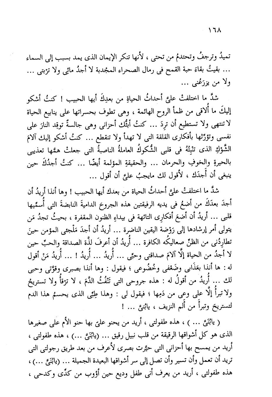 شدَّ ما اختلفتْ عليَّ أحداثُ الحياة من بعدك أيها الحبيب! وها أنذا أريدُ أن أجدَ بعدَكَ من أضعُ في يديه الرفيقتين هذه الجروحَ الداميةَ النابضةَ التي أسمِّيها قلبي. . . أريدُ أن أضعَ أفكارِي التائهة في بيداءِ الظنون المقفرة، بحيث تجدُ مَن يتولى أمر إرشادها إلى رَوْضة اليقين الناضرة. . . أريدُ أن أجدَ مَلْجئى المؤمن حينَ تطارِدُنى من الظن صعاليكُه الكافرة. . . . أُريدُ أن أعرفَ لذَّة الصداقة والحبِّ حين لا أجدُ من الحياة إلاَّ آلامَ صداقتي وحبِّي. . . . أُريدُ. . . . أُريدُ! . . . . أُريدُ مَنْ أقول له: ها أنذا بعَذَابِي وضَعْفي وخُضُوعي؛ فيقول: وها أنذا بصبري وقوَّتي وحبي لك. . . . أُريدُ من أقولُ له: هذه جروحي التي تَنْفُثُ الدَّمَ، لا ترْقأُ ولا تستريحُ ولا تبرأُ إلاَّ على وعي من دَمِها؛ فيقول لي: وهذا طِبِّى الذي يحسمُ هذا الدم لتستريحَ وتبرأَ من أَلم النزيف، يا بُنيَّ. . . .!