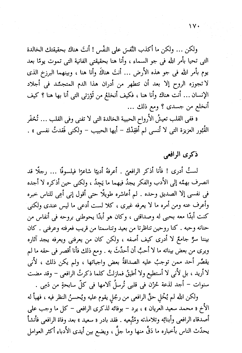 لستُ أدري! فأنا أذكر الرافعيّ. أعرفهُ أديبًا شاعرًا فيلسوفًا. . . رجلًا قد انصرف بهمِّه إلى الأدب والفكر يجدُ فيهما ما يَجِدُ، ولكني حين أذكره لا أجده في نفسي إلا الصديق وحده. لم أعاشره طويلًا حتى أقول إني أعِى للناس خبره وأعرف عنه ومن أمره ما لا يعرفه غيري، كلا لست أدعى ما ليس عندي ولكني كنت أبدًا معه بحبي له وصداقتي، وكان هو أبدًا يحوطنى بروحه في أنفاس من حنانه وحبه. كنا روحين تناظرتا من بعيد وتناسمتا من قريب فعرفته وعرفنى. كان بيننا سرٌّ جامعٌ لا أدري كيف أصفه، ولكن كان من يعرفنى ويعرفه يجد آثاره ويرى من بعض بيناته ما لا أحبُّ أن أحدِّثَ به. ومع ذلك فأنا أقصر في حقه ما لم يقصِّر أحد ممن توجبُ عليه الصداقةُ بعض واجباتها، ولم يكن ذلك، لأني لا أريد، بل لأنى لا أستطيع ولا أطيقُ فما زلتُ كلما ذكرتُ الرافعي -وقد مضت سنوات- أجد لذعة حُزْن في قلبي تُرسلُ آلامها في كلّ سابحةٍ من دَمِي.