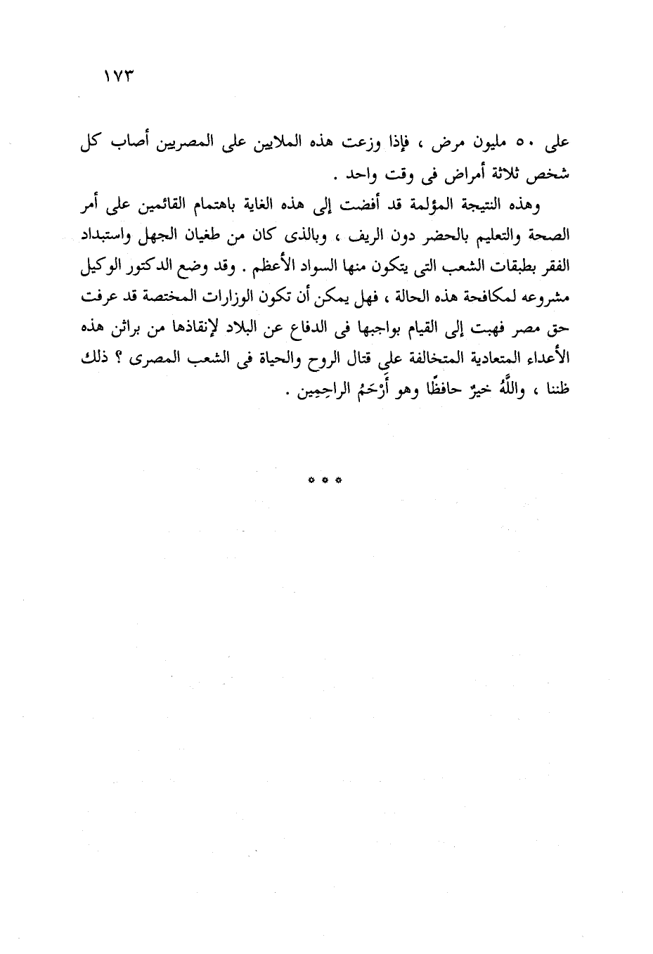 وهذه النتيجة المؤلمة قد أفضت إلى هذه الغاية باهتمام القائمين على أمر الصحة والتعليم بالحضر دون الريف، وبالذي كان من طغيان الجهل واستبداد الفقر بطبقات الشعب التي يتكون منها السواد الأعظم. وقد وضع الدكتور الوكيل مشروعه لمكافحة هذه الحالة، فهل يمكن أن تكون الوزارات المختصة قد عرفت حق مصر فهبت إلى القيام بواجبها في الدفاع عن البلاد لإنقاذها من براثن هذه الأعداء المتعادية المتخالفة على قتال الروح والحياة في الشعب المصرى؟ ذلك ظننا، واللَّهُ خيرٌ حافظًا وهو أَرْحَمُ الراحِمِين.