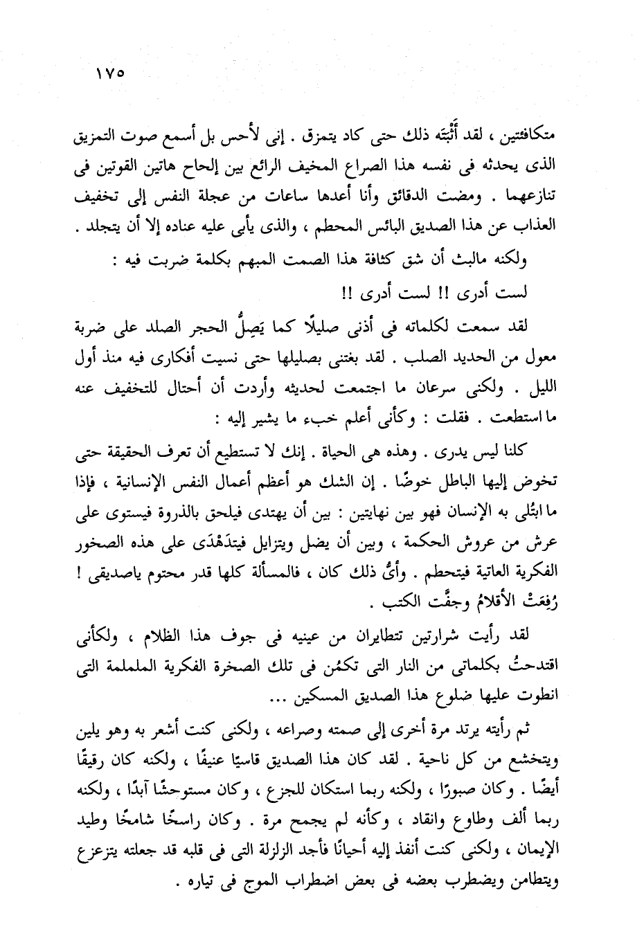 ثم رأيته يرتد مرة أخرى إلى صمته وصراعه، ولكني كنت أشعر به وهو يلين ويتخشع من كل ناحية. لقد كان هذا الصديق قاسيًا عنيفًا، ولكنه كان رقيقًا أيضًا. وكان صبورًا، ولكنه ربما استكان للجزع، وكان مستوحشًا آبدًا، ولكنه ربما ألف وطاوع وانقاد، وكأنه لم يجمح مرة. وكان راسخًا شامخًا وطيد الإيمان، ولكني كنت أنفذ إليه أحيانًا فأجد الزلزلة التي في قلبه قد جعلته يتزعزع ويتطامن ويضطرب بعضه في بعض اضطراب الموج في تياره.