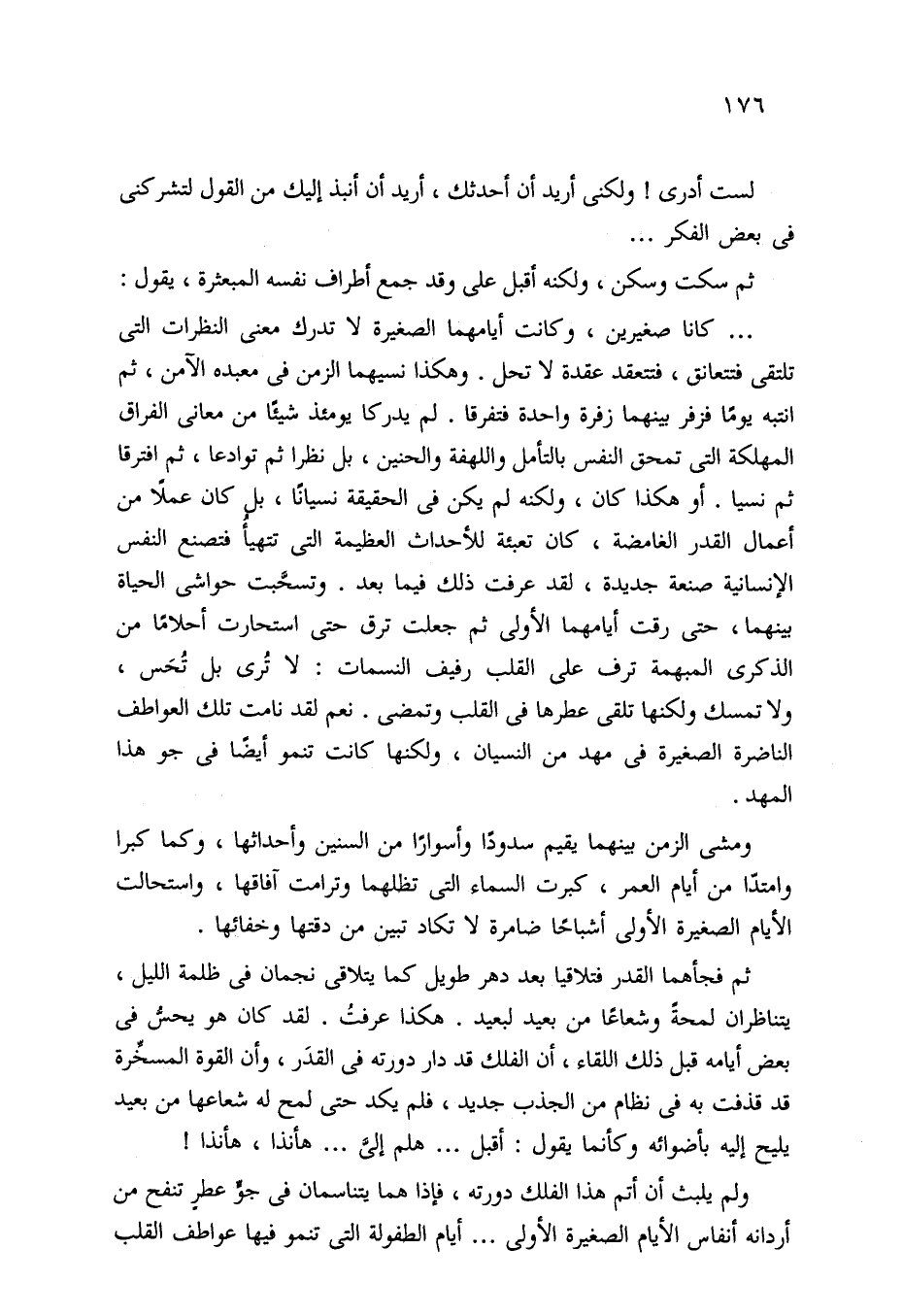 ثم سكت وسكن، ولكنه أقبل على وقد جمع أطراف نفسه المبعثرة، يقول: . . . كانا صغيرين، وكانت أيامهما الصغيرة لا تدرك معنى النظرات التي تلتقي فتتعانق، فتتعقد عقدة لا تحل. وهكذا نسيهما الزمن في معبده الآمن، ثم انتبه يومًا فزفر بينهما زفرة واحدة فتفرقا. لم يدركا يومئذ شيئًا من معاني الفراق المهلكة التي تمحق النفس بالتأمل واللهفة والحنين، بل نظرا ثم توادعا، ثم افترقا ثم نسيا. أو هكذا كان، ولكنه لم يكن في الحقيقة نسيانًا، بل كان عملًا من أعمال القدر الغامضة، كان تعبئة للأحداث العظيمة التي تتهيأ فتصنع النفس الإنسانية صنعة جديدة، لقد عرفت ذلك فيما بعد. وتسحَّبت حواشي الحياة بينهما، حتى رقت أيامهما الأولى ثم جعلت ترق حتى استحارت أحلامًا من الذكرى المبهمة ترف على القلب رفيف النسمات: لا تُرى بل تُحَس، ولا تمسك ولكنها تلقى عطرها في القلب وتمضي. نعم لقد نامت تلك العواطف الناضرة الصغيرة في مهد من النسيان، ولكنها كانت تنمو أيضًا في جو هذا المهد.