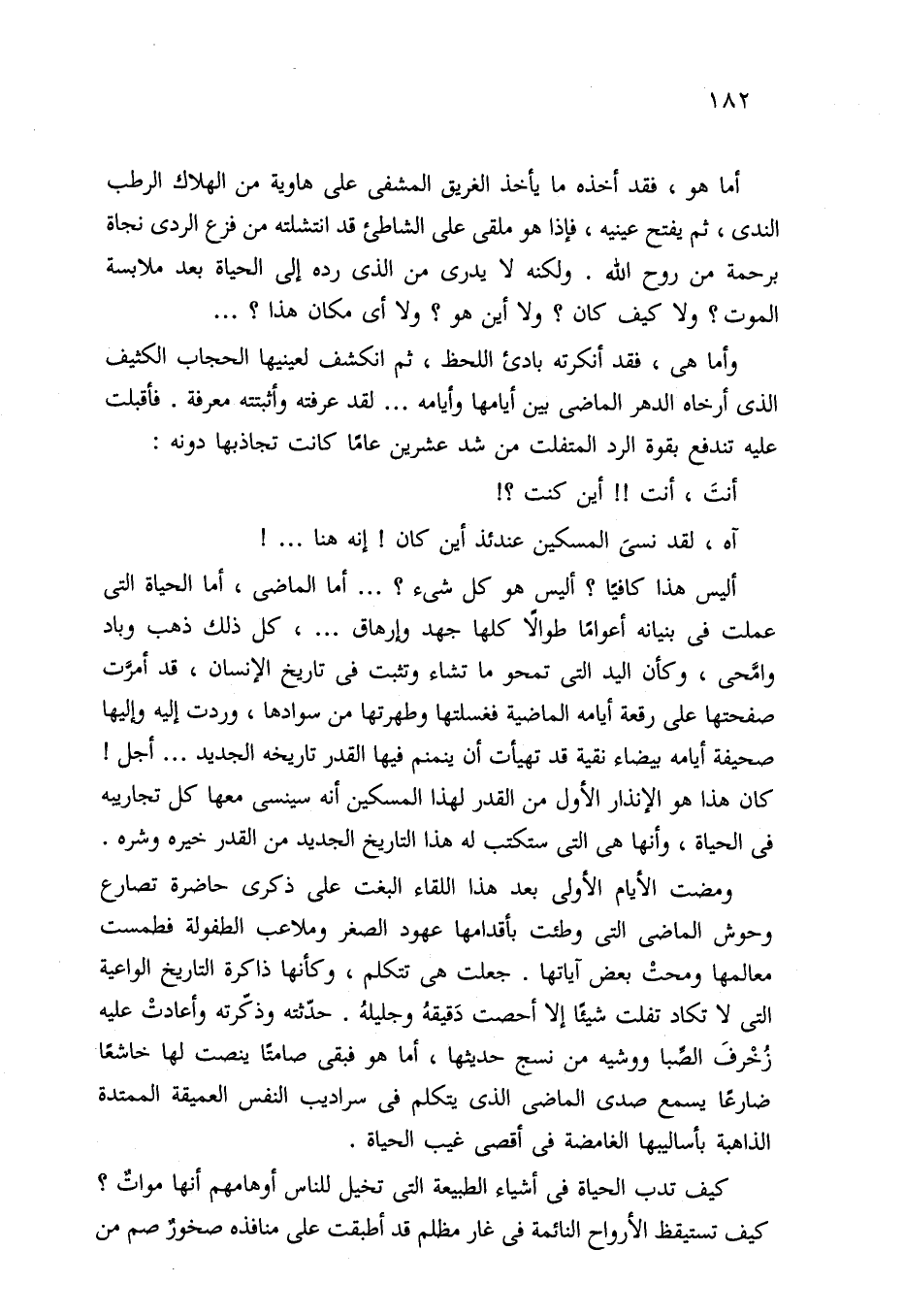 أما هو، فقد أخذه ما يأخذ الغريق المشفي على هاوية من الهلاك الرطب الندى، ثم يفتح عينيه، فإذا هو ملقى على الشاطئ قد انتشلته من فزع الردى نجاة برحمة من روح الله. ولكنه لا يدري من الذي رده إلى الحياة بعد ملابسة الموت؟ ولا كيف كان؟ ولا أين هو؟ ولا أي مكان هذا؟ . . .