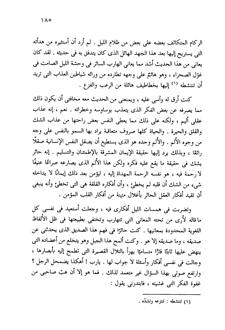 كنت أرق له وآسى عليه، ويمنعني من الحديث معه مخافتي أن يكون ذلك مما يصرفه عن بعض الفكر الذي يتعذب بوساوسه وخطراته. نعم، إنه عذاب عقلي أليم، ولكنه على ذلك مما يعطى النفس بعض راحتها من عذاب الشك والقلق والحيرة. والحياة كلها صروف متعاقبة يراد بها السمو بالنفس على وجه من وجوه الألم. والألم وحده هو الذي يستطيع أن يصقل النفس الإنسانية صقلًا رائعًا، وبذلك يرد إليها حقيقة الإيمان المشرقة بالإطمئنان والتسليم. إنه حائر يشك في حقيقة ما يقع عليه فكره ولكن هذا الألم الذي يصارعه صراعًا عنيفًا لا رحمة فيه، هو نفسه الرحمة المهداة إليه، ليؤمن بعد ذلك إيمانًا لا يداخله شيء من الشك أن قلبه لم يخطئ، وأن أفكاره القلقة هي التي تخطئ وأنه ينبغي أن تقيد أفكار العقل الحائر بأغلال متينة من أفكار القلب المؤمن.