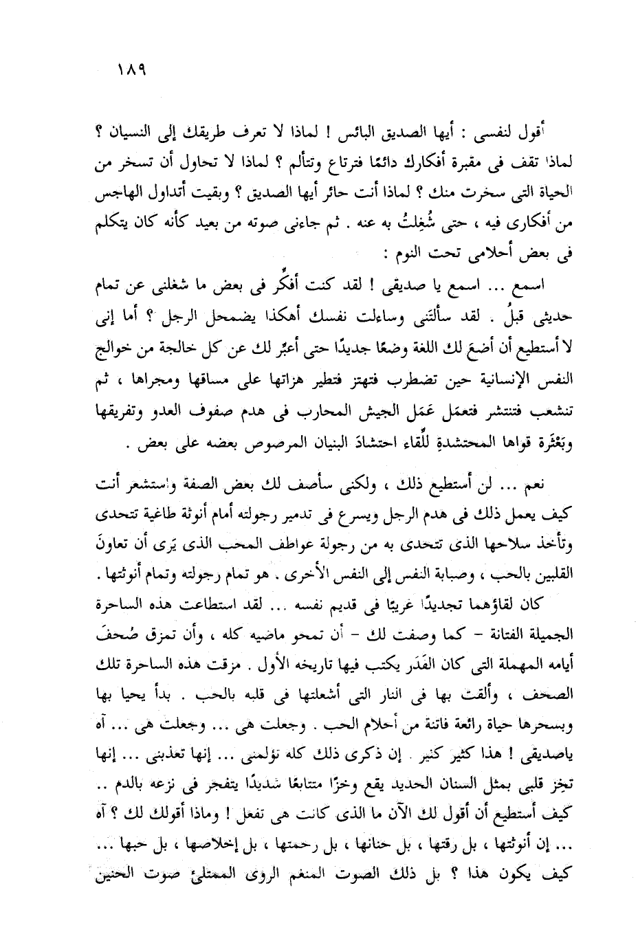 نعم. . . لن أستطيع ذلك، ولكني سأصف لك بعض الصفة وأستشعر أنت كيف يعمل ذلك في هدم الرجل ويسرع في تدمير رجولته أمام أنوثة طاغية تتحدى وتأخذ سلاحها الذي تتحدى به من رجولة عواطف المحب الذي يَرى أن تعاونَ القلبين بالحب، وصبابة النفس إلى النفس الأخرى، هو تمام رجولته وتمام أنوثتها. كان لقاؤهما تجديدًا غريبًا في قديم نفسه. . . لقد استطاعت هذه الساحرة الجميلة الفتانة -كما وصفت لك- أن تمحو ماضيه كله، وأن تمزق صُحفَ أيامه المهملة التي كان القَدَر يكتب فيها تاريخه الأول. مزقت هذه الساحرة تلك الصحف، وألقت بها في النار التي أشعلتها في قلبه بالحب. بدأ يحيا بها وبسحرها حياة رائعة فاتنة من أحلام الحب. وجعلت هي. . . وجعلت هي. . . آه يا صديقي! هذا كثير كثير. إن ذكرى ذلك كله تؤلمني. . . إنها تعذبني. . . إنها تخِز قلبي بمثل السنان الحديد يقع وخزًا متتابعًا شديدًا يتفجر في نزعه بالدم .. كيف أستطيع أن أقول لك الآن ما الذي كانت هي تفعل! وماذا أقول لك؟ آه. . . إن أنوثتها، بل رقتها، بل حنانها، بل رحمتها، بل إخلاصها، بل حبها .. كيف يكون هذا؟ بل ذلك الصوت المنغم الروى الممتلئ صوت الحنين
