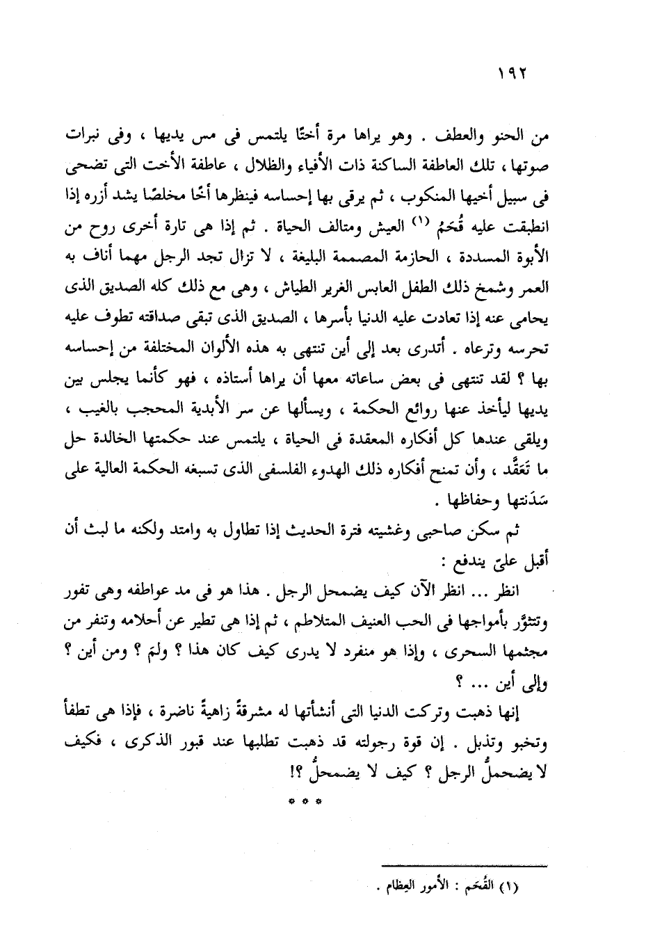 من الحنو والعطف. وهو يراها مرة أختًا يلتمس في مس يديها، وفي نبرات صوتها، تلك العاطفة الساكنة ذات الأفياء والظلال، عاطفة الأخت التي تضحي في سبيل أخيها المنكوب، ثم يرقى بها إحساسه فينظرها أخًا مخلصًا يشد أزره إذا انطبقت عليه قُحَمُ (¬1) العيش ومتالف الحياة. ثم إذا هي تارة أخرى روح من الأبوة المسددة، الحازمة المصممة البليغة، لا تزال تجد الرجل مهما أناف به العمر وشمخ ذلك الطفل العابس الغرير الطياش، وهي مع ذلك كله الصديق الذي يحامى عنه إذا تعادت عليه الدنيا بأسرها، الصديق الذي تبقى صداقته تطوف عليه تحرسه وترعاه. أتدري بعد إلى أين تنتهي به هذه الألوان المختلفة من إحساسه بها؟ لقد تنتهي في بعض ساعاته معها أن يراها أستاذه، فهو كأنما يجلس بين يديها ليأخذ عنها روائع الحكمة، ويسألها عن سر الأبدية المحجب بالغيب، ويلقى عندها كل أفكاره المعقدة في الحياة، يلتمس عند حكمتها الخالدة حل ما تَعَقَّد، وأن تمنح أفكاره ذلك الهدوء الفلسفي الذي تسبغه الحكمة العالية على سَدَنتها وحفاظها.