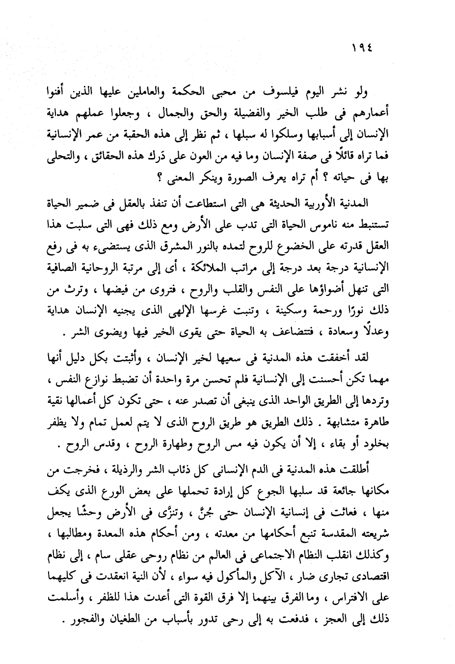 المدنية الأوربية الحديثة هي التي استطاعت أن تنفذ بالعقل في ضمير الحياة تستنبط منه ناموس الحياة التي تدب على الأرض ومع ذلك فهي التي سلبت هذا العقل قدرته على الخضوع للروح لتمده بالنور المشرق الذي يستضيء به في رفع الإنسانية درجة بعد درجة إلى مراتب الملائكة، أي إلى مرتبة الروحانية الصافية التي تنهل أضواؤها على النفس والقلب والروح، فتروى من فيضها، وترث من ذلك نورًا ورحمة وسكينة، وتنبت غرسها الإلهي الذي يجنيه الإنسان هداية وعدلًا وسعادة، فتتضاعف به الحياة حتى يقوى الخير فيها ويضوى الشر.