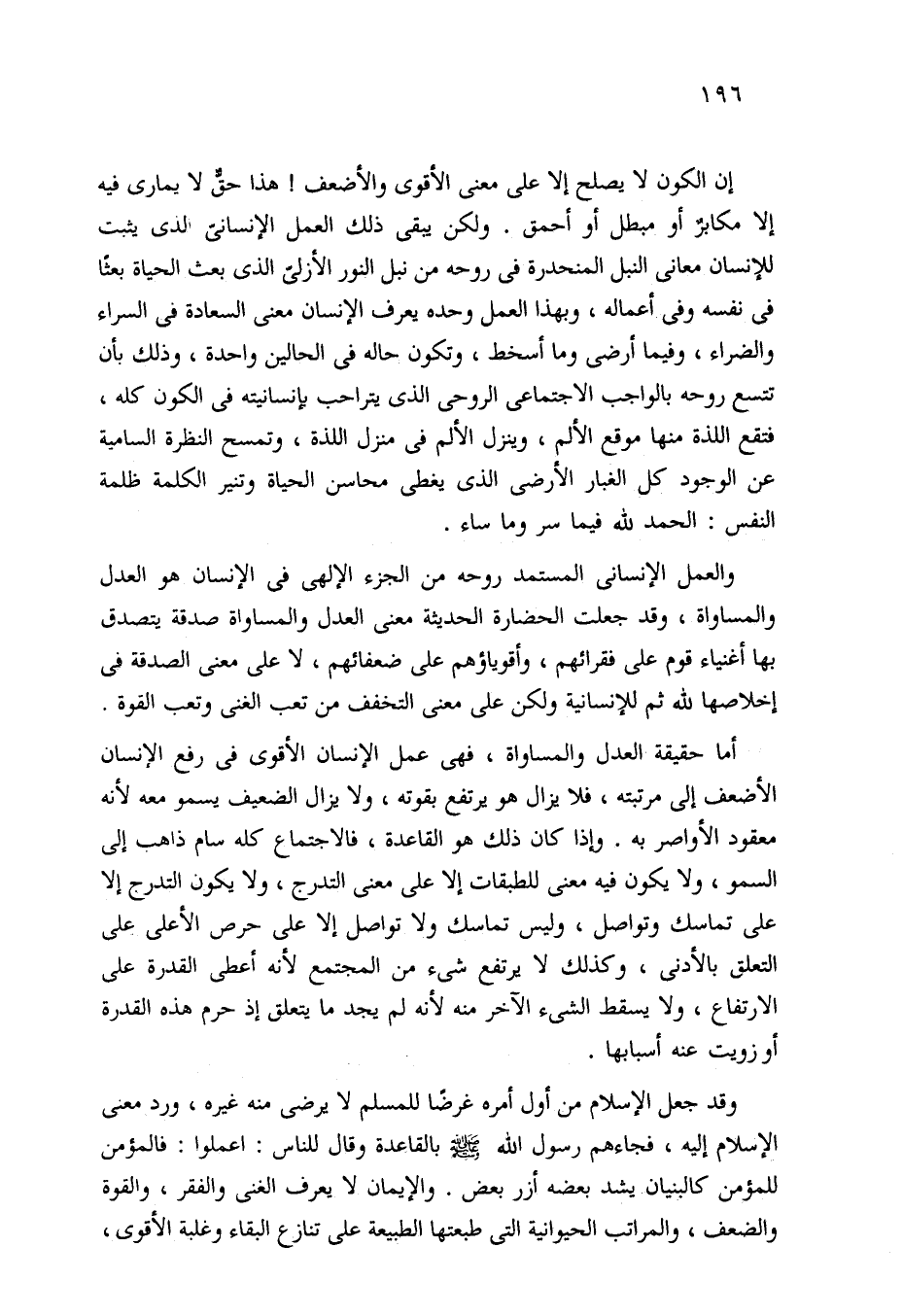 أما حقيقة العدل والمساواة، فهي عمل الإنسان الأقوى في رفع الإنسان الأضعف إلى مرتبته، فلا يزال هو يرتفع بقوته، ولا يزال الضعيف يسمو معه لأنه معقود الأواصر به. وإذا كان ذلك هو القاعدة، فالاجتماع كله سام ذاهب إلى السمو، ولا يكون فيه معنى للطبقات إلا على معنى التدرج، ولا يكون التدرج إلا على تماسك وتواصل، وليس تماسك ولا تواصل إلا على حرص الأعلى على التعلق بالأدنى، وكذلك لا يرتفع شيء من المجتمع لأنه أعطى القدرة على الارتفاع، ولا يسقط الشيء الآخر منه لأنه لم يجد ما يتعلق إذ حرم هذه القدرة أو زويت عنه أسبابها.