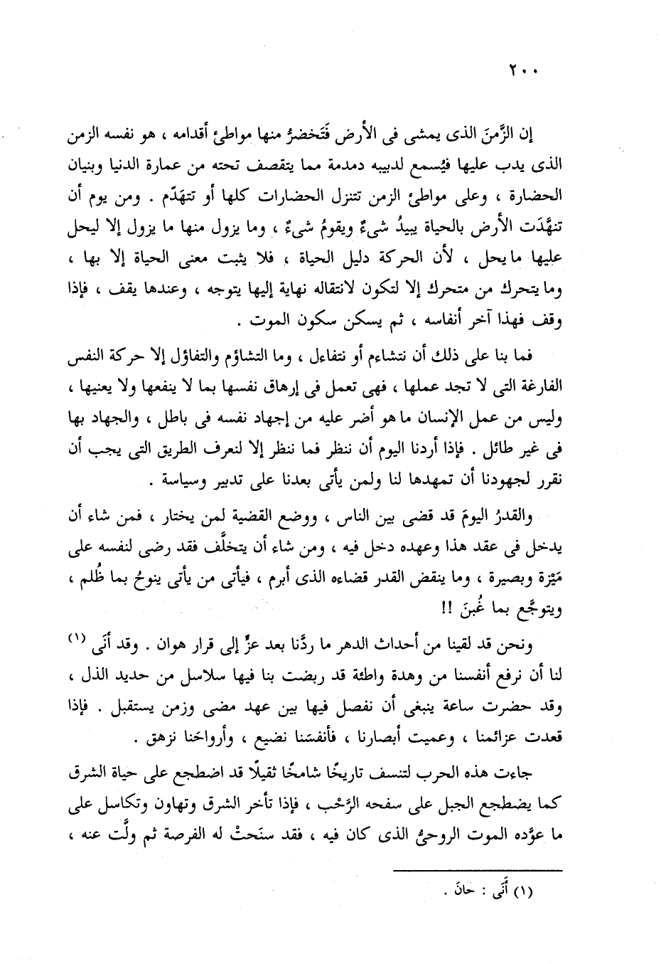 إن الزمنَ الذي يمشي في الأرض فَتَخضرُّ منها مواطئ أقدامه، هو نفسه الزمن الذي يدب عليها فيُسمع لدبيبه دمدمة مما يتقصف تحته من عمارة الدنيا وبنيان الحضارة، وعلى مواطئ الزمن تتنزل الحضارات كلها أو تتهَدم. ومن يوم أن تنهَّدَت الأرض بالحياة يبيدُ شيءٌ ويقومُ شيءٌ، وما يزول منها ما يزول إلا ليحل عليها ما يحل، لأن الحركة دليل الحياة، فلا يثبت معنى الحياة إلا بها، وما يتحرك من متحرك إلا لتكون لانتقاله نهاية إليها يتوجه، وعندها يقف، فإذا وقف فهذا آخر أنفاسه، ثم يسكن سكون الموت.