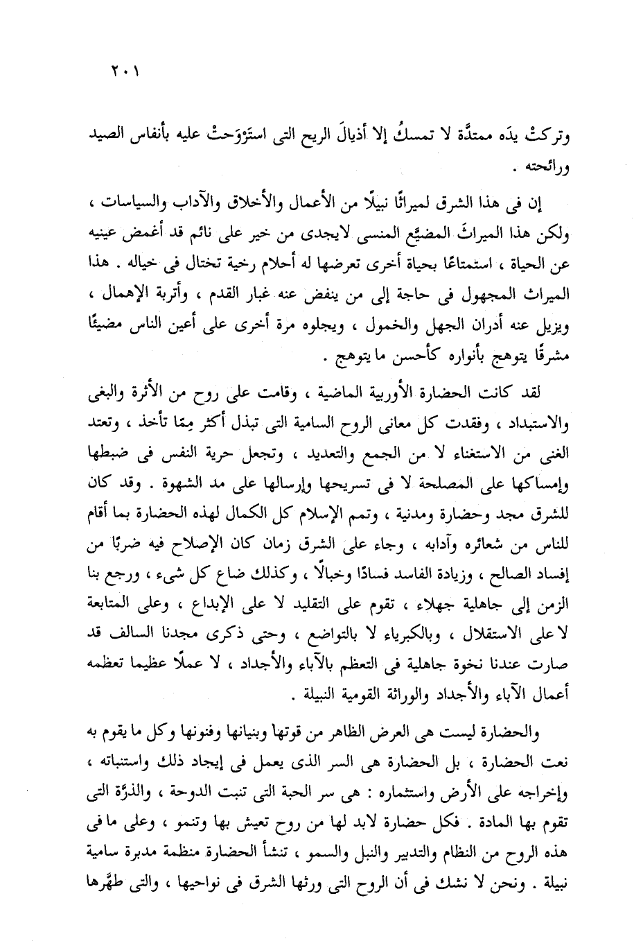 لقد كانت الحضارة الأوربية الماضية، وقامت على روح من الأثرة والبغى والاستبداد، وفقدت كل معاني الروح السامية التي تبذل أكثر مِمّا تأخذ، وتعتد الغنى من الاستغناء لا من الجمع والتعديد، وتجعل حرية النفس في ضبطها وإمساكها على المصلحة لا في تسريحها وإرسالها على مد الشهوة. وقد كان للشرق مجد وحضارة ومدنية، وتمم الإسلام كل الكمال لهذه الحضارة بما أقام للناس من شعائره وآدابه، وجاء على الشرق زمان كان الإصلاح فيه ضربًا من إفساد الصالح، وزيادة الفاسد فسادًا وخبالًا، وكذلك ضاع كل شيء، ورجع بنا الزمن إلى جاهلية جهلاء، تقوم على التقليد لا على الإبداع، وعلى المتابعة لا على الاستقلال، وبالكبرياء لا بالتواضع، وحتى ذكرى مجدنا السالف قد صارت عندنا نخوة جاهلية في التعظم بالآباء والأجداد، لا عملًا عظيما تعظمه أعمال الآباء والأجداد والوراثة القومية النبيلة.
