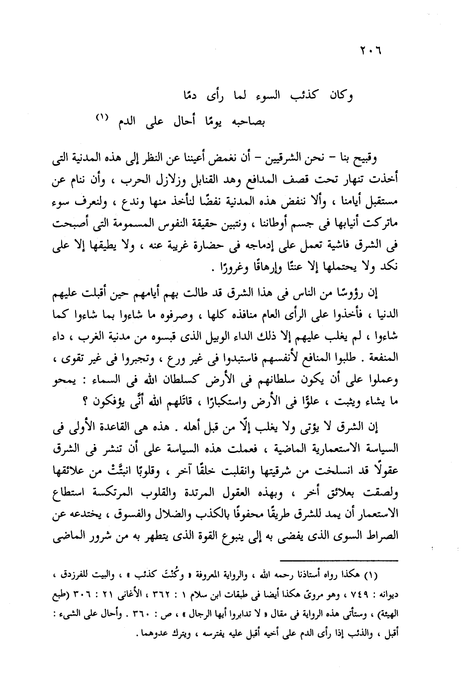 وقبيح بنا -نحن الشرقيين- أن نغمض أعيننا عن النظر إلى هذه المدنية التي أخذت تنهار تحت قصف المدافع وهد القنابل وزلازل الحرب، وأن ننام عن مستقبل أيامنا، وألا ننفض هذه المدنية نفضًا لنأخذ منها وندع، ولنعرف سوء ما تركت أنيابها في جسم أوطاننا، ونتبين حقيقة النفوس المسمومة التي أصبحت في الشرق فاشية تعمل على إدماجه في حضارة غريبة عنه، ولا يطيقها إلا على نكد ولا يحتملها إلا عنتًا وإرهاقًا وغرورًا.