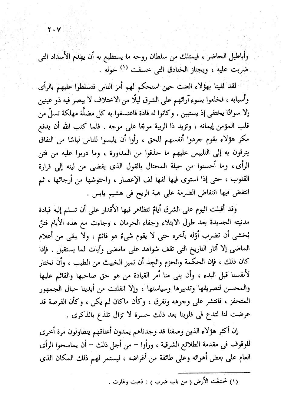وقد أقبلت اليوم على الشرق أيامٌ تتظاهر فيها الأقدار على أن تسلم إليه قيادة مدنيته الجديدة بعد طول الابتلاء وجفاء الحرمان، وجاءت مع هذه الأيام فتنٌ يُخشى أن تضرب أوّله بآخره حتى لا يقوم شيءٌ هو قائمٌ، ولا يبقى من أعلام الماضي إلا آثار التاريخ التي تقف شواهد على ما مضى وآيات لما يستقبل. فإذا كان ذلك، فإن الحكمة والحزم والجِد أن نميز الخبيث من الطيب، وأن نختار لأنفسنا قبل البدء، وأن يلي منا أمر القيادة من هو حق صاحبها والقائم عليها والمحسن لتصريفها وتدبيرها وسياستها، وإلا انفلتت من أيدينا حبال الجمهور المتحفز، فانتشر على وجوهه وتفرق، وكأن ما كان لم يكن، وكأن الفرصة قد عرضت لنا لتدع في قلوبنا بعد ذلك حسرة لا تزال تلذع بالذكرى.