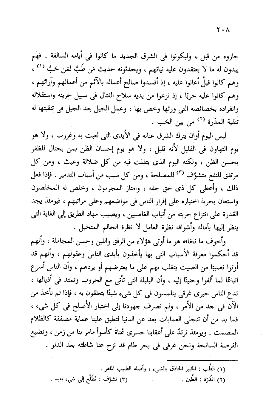 ليس اليوم أوان يترك الشرق عنانه في الأيدي التي لعبت به وغررت، ولا هو يوم التهاون في القليل لأنه قليل، ولا هو يوم إحسان الظن بمن يحتال للظفر بحسن الظن، ولكنه اليوم الذي يتفلت فيه من كل ضلالة وعبث، ومن كل مرتفق للنفع متشوِّف (¬3) للمصلحة، ومن كل سبب من أسباب التدمير. فإذا فعل ذلك، وأعطى كل ذي حق حقه، وامتاز المجرمون، وخلص له المخلصون واستعان بحرية اختياره على إقرار الناس في مواضعهم وعلى مراتبهم، فيومئذ يجد القدرة على انتزاع حريته من أنياب الغاصبين، ويصيب مهاد الطريق إلى الغاية التي ينظر إليها بآماله وأشواقه نظرة العامل لا نظرة الحالم المتخيل.