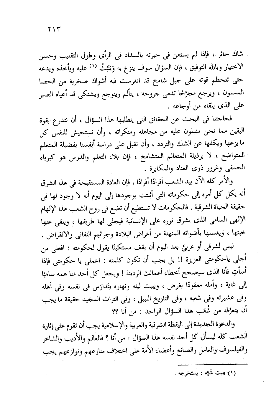 والدعوة الجديدة إلى اليقظة الشرقية والعربية والإسلامية يجب أن تقوم على إثارة الشعب كله ليسأل كل أحد نفسه هذا السؤال: من أنا؟ فالعالم والأديب والشاعر والفيلسوف والعامل والصانع وأعضاء الأمة على اختلاف منازعهم ونوازعهم يجب