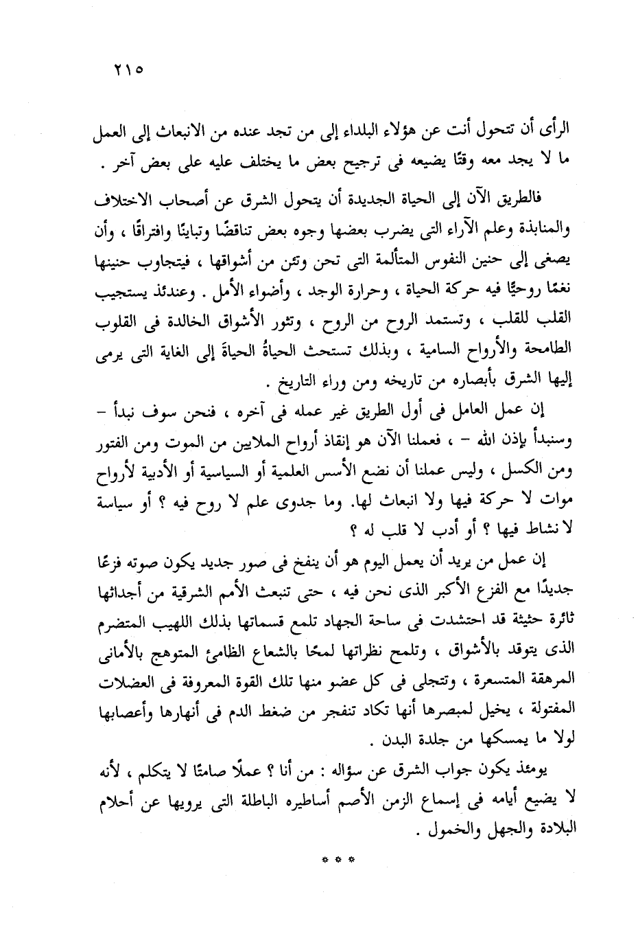 إن عمل من يريد أن يعمل اليوم هو أن ينفخ في صور جديد يكون صوته فزعًا جديدًا مع الفزع الأكبر الذي نحن فيه، حتى تنبعث الأمم الشرقية من أجداثها ثائرة حثيثة قد احتشدت في ساحة الجهاد تلمع قسماتها بذلك اللهيب المتضرم الذي يتوقد بالأشواق، وتلمح نظراتها لمحًا بالشعاع الظامئ المتوهج بالأماني المرهقة المتسعرة، وتتجلى في كل عضو منها تلك القوة المعروفة في العضلات المفتولة، يخيل لمبصرها أنها تكاد تنفجر من ضغط الدم في أنهارها وأعصابها لولا ما يمسكها من جلدة البدن.