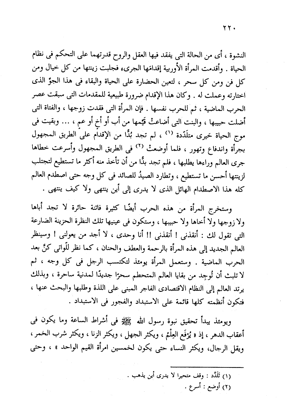 وستخرج المرأة من هذه الحرب أيضًا كثيرة فاتنة حائرة لا تجد أباها ولا زوجها ولا أخاها ولا حبيبها، وستكون في عينيها تلك النظرة الحزينة الضارعة التي تقول لك: أنقذني! أنقذني! ! أنا وحدي، لا أجد من يعولني! وسينظر العالم الجديد إلى هذه المرأة بالرحمة والعطف والحنان، كما نظر للّواتي كنَ بعد الحرب الماضية. وستعمل المرأة يومئذ لتكتسب الرجل في كل وجه، ثم لا تلبث أن تُوجِد من بقايا العالم المتحطم سحرًا جديدًا لمدنية ساحرة، وبذلك يرتد العالم إلى النظام الاقتصادي الفاجر المبني على اللذة وطلبها والبحث عنها، فتكون أنظمته كلها قائمة على الاستبداد والفجور في الاستبداد.