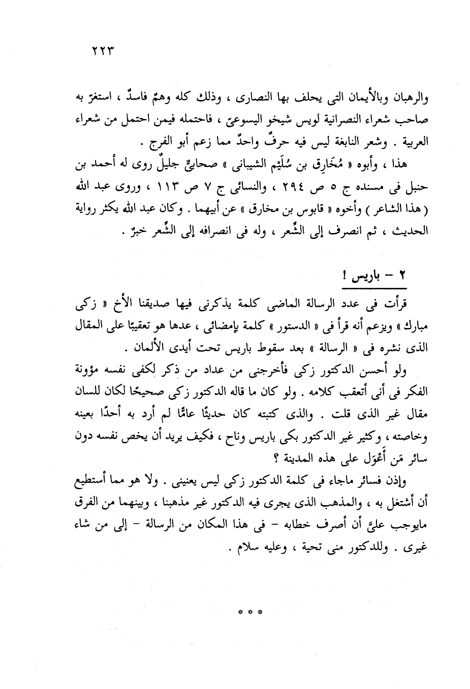 ولو أحسن الدكتور زكي فأخرجني من عداد من ذكر لكفى نفسه مؤونة الفكر في أنى أتعقب كلامه. ولو كان ما قاله الدكتور زكي صحيحًا لكان للسان مقال غير الذي قلت. والذي كتبته كان حديثًا عامًّا لم أرد به أحدًا بعينه وخاصته، وكثير غير الدكتور بكى باريس وناح، فكيف يريد أن يخص نفسه دون سائر مَن أَعْوَل على هذه المدينة؟