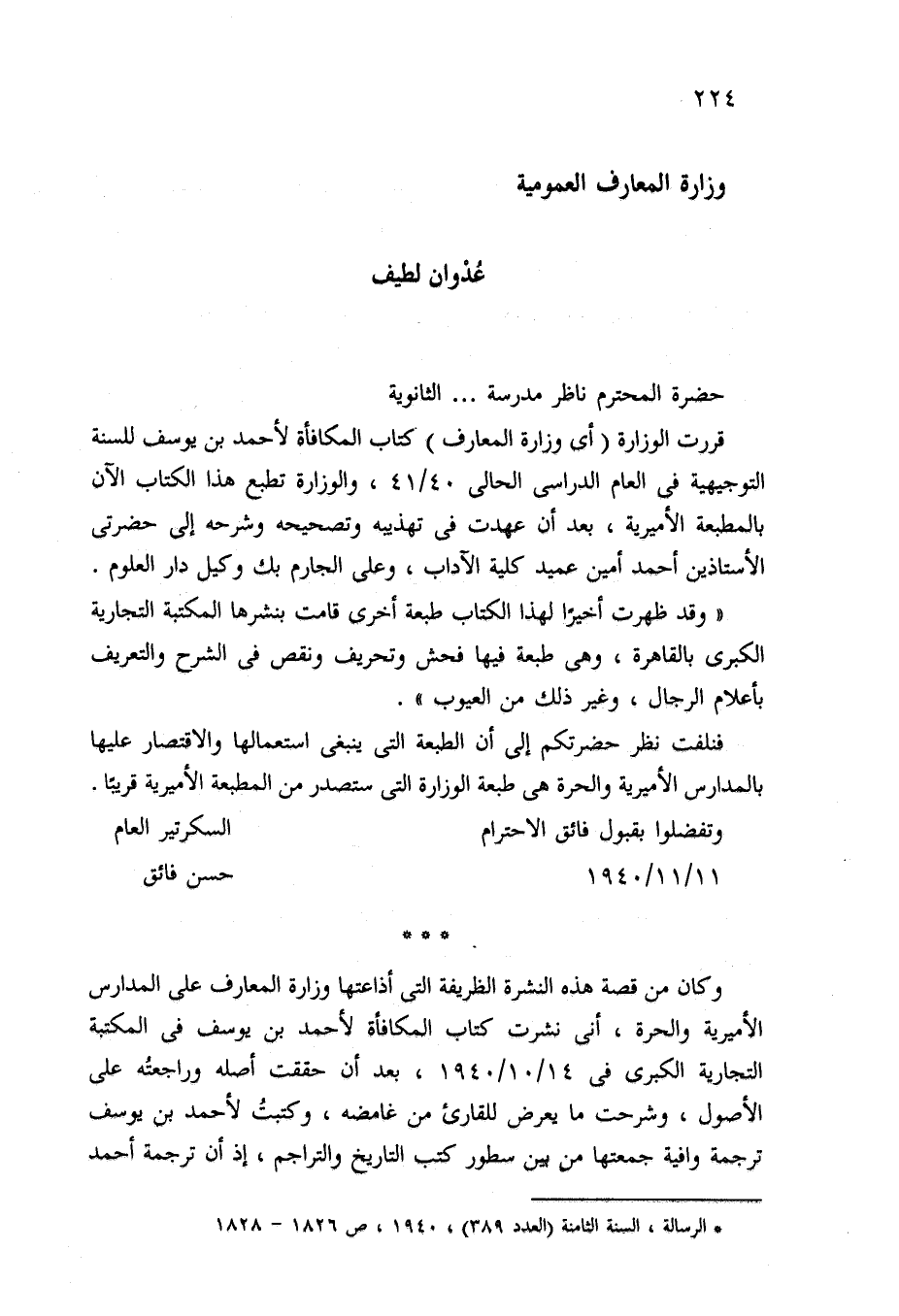 قررت الوزارة (أي وزارة المعارف) كتاب المكافأة لأحمد بن يوسف للسنة التوجيهية في العام الدراسي الحالي 40/ 41، والوزارة تطبع هذا الكتاب الآن بالمطبعة الأميرية، بعد أن عهدت في تهذيبه وتصحيحه وشرحه إلى حضرتى الأستاذين أحمد أمين عميد كلية الآداب، وعلي الجارم بك وكيل دار العلوم.