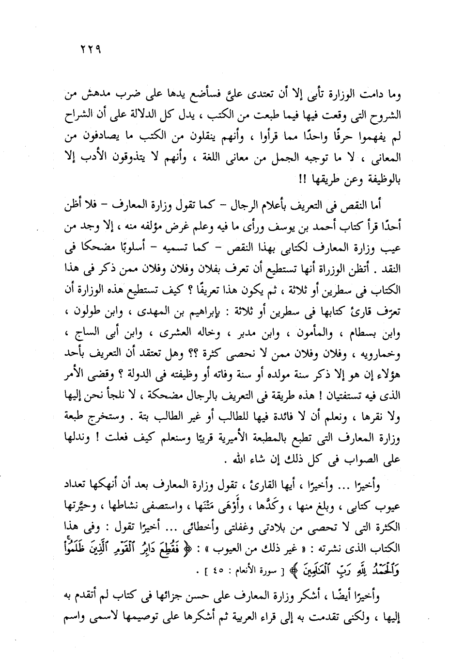 أما النقص في التعريف بأعلام الرجال -كما تقول وزارة المعارف- فلا أظن أحدًا قرأ كتاب أحمد بن يوسف ورأى ما فيه وعلم غرض مؤلفه منه، إلا وجد من عيب وزارة المعارف لكتابي بهذا النقص -كما تسميه- أسلوبًا مضحكا في النقد. أتظن الوزراة أنها تستطيع أن تعرف بفلان وفلان وفلان ممن ذكر في هذا الكتاب في سطرين أو ثلاثة، ثم يكون هذا تعريفًا؟ كيف تستطيع هذه الوزارة أن تعرف قارئ كتابها في سطرين أو ثلاثة: بإبراهيم بن المهدي، وابن طولون، وابن بسطام، والمأمون، وابن مدبر، وخاله العشرى، وابن أبي الساج، وخمارويه، وفلان وفلان ممن لا نحصى كثرة؟ ؟ وهل تعتقد أن التعريف بأحد هؤلاء إن هو إلا ذكر سنة مولده أو سنة وفاته أو وظيفته في الدولة؟ وقضى الأمر الذي فيه تستفتيان! هذه طريقة في التعريف بالرجال مضحكة، لا نلجأ نحن إليها ولا نقرها، ونعلم أن لا فائدة فيها للطالب أو غير الطالب بتة. وستخرج طبعة وزارة المعارف التي تطبع بالمطبعة الأميرية قريبًا وسنعلم كيف فعلت! وندلها على الصواب في كل ذلك إن شاء الله.