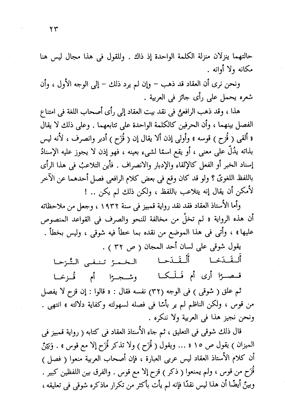 هذا، وقد ذهب الرافعيُّ نقد بيت العقاد إلى رأي أصحاب اللغة في امتناع الفصل بينهما، وأن الحرفين كالكلمة الواحدة على تتابعهما. وعلى ذلك لا يقال "ألقى (قُزح) قوسه" وأولى إذن ألا يقال إن (قُزَح) أدبر وانصرف، لأنه ليس بذاته يدُلّ على معنى، أو يقع اسمًا لشيء بعينه، فهو إذن لا يجوز عليه الإسنادُ إسناد الخبر أو الفعل كالإلقاء والإدبار والانصراف. فأين التلاعبُ في هذا الرأي باللفظ اللغويّ؟ ولو قد كان وقع في بعض كلام الرافعي فصل أحدهما عن الآخر لأمكن أن يقال إنه يتلاعب باللفظ، ولكن ذلك لم يكن. .!