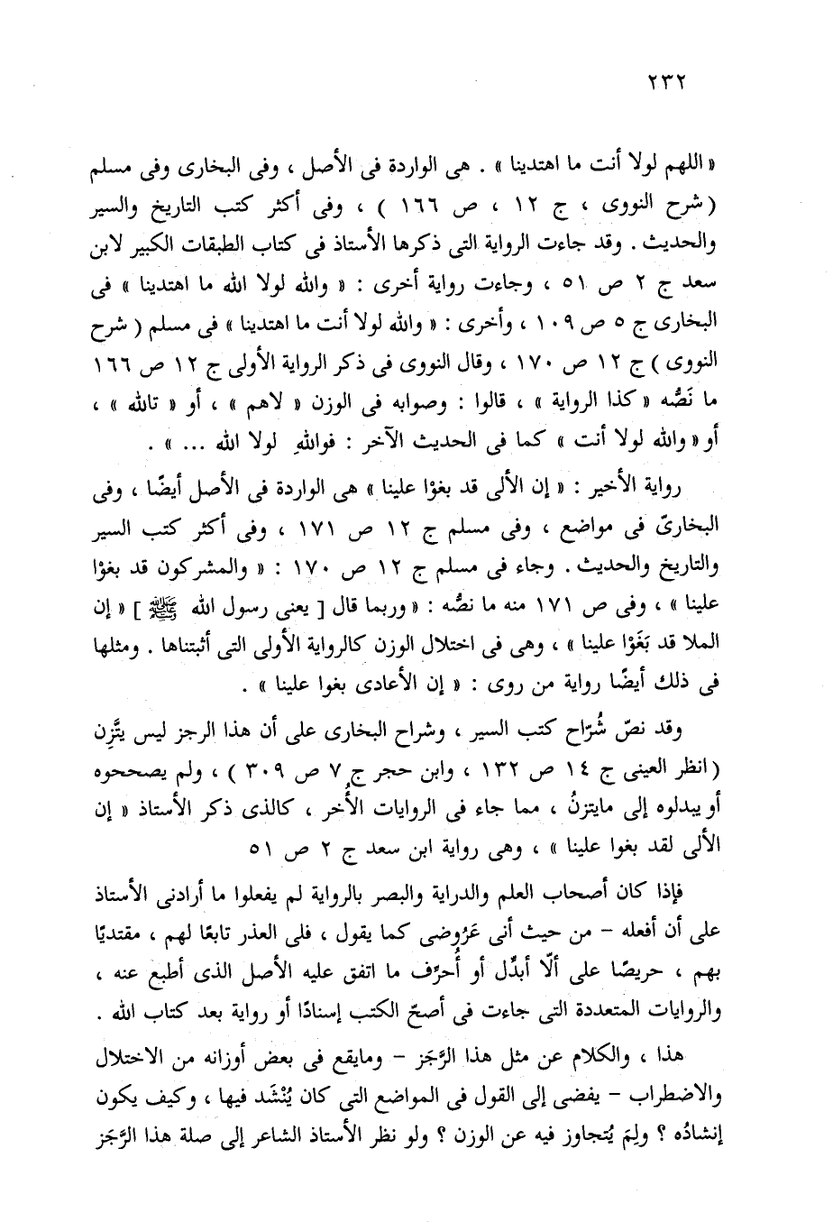 "اللهم لولا أنت ما اهتدينا". هي الواردة في الأصل، وفي البخاري وفي مسلم (شرح النووي، ج 12، ص 166)، وفي أكثر كتب التاريخ والسير والحديث. وقد جاءت الرواية التي ذكرها الأستاذ في كتاب الطبقات الكبير لابن سعد ج 2 ص 51، وجاءت رواية أخرى: "والله لولا الله ما اهتدينا" في البخاري ج 5 ص 109، وأخرى: "والله لولا أنت ما اهتدينا" في مسلم (شرح النووي) ج 12 ص 170، وقال النووي في ذكر الرواية الأولى ج 12 ص 166 ما نَصُّه "كذا الرواية"، قالوا: وصوابه في الوزن "لاهم"، أو "تالله"، أو "والله لولا أنت" كما في الحديث الآخر: فواللهِ لولا الله. . . .".