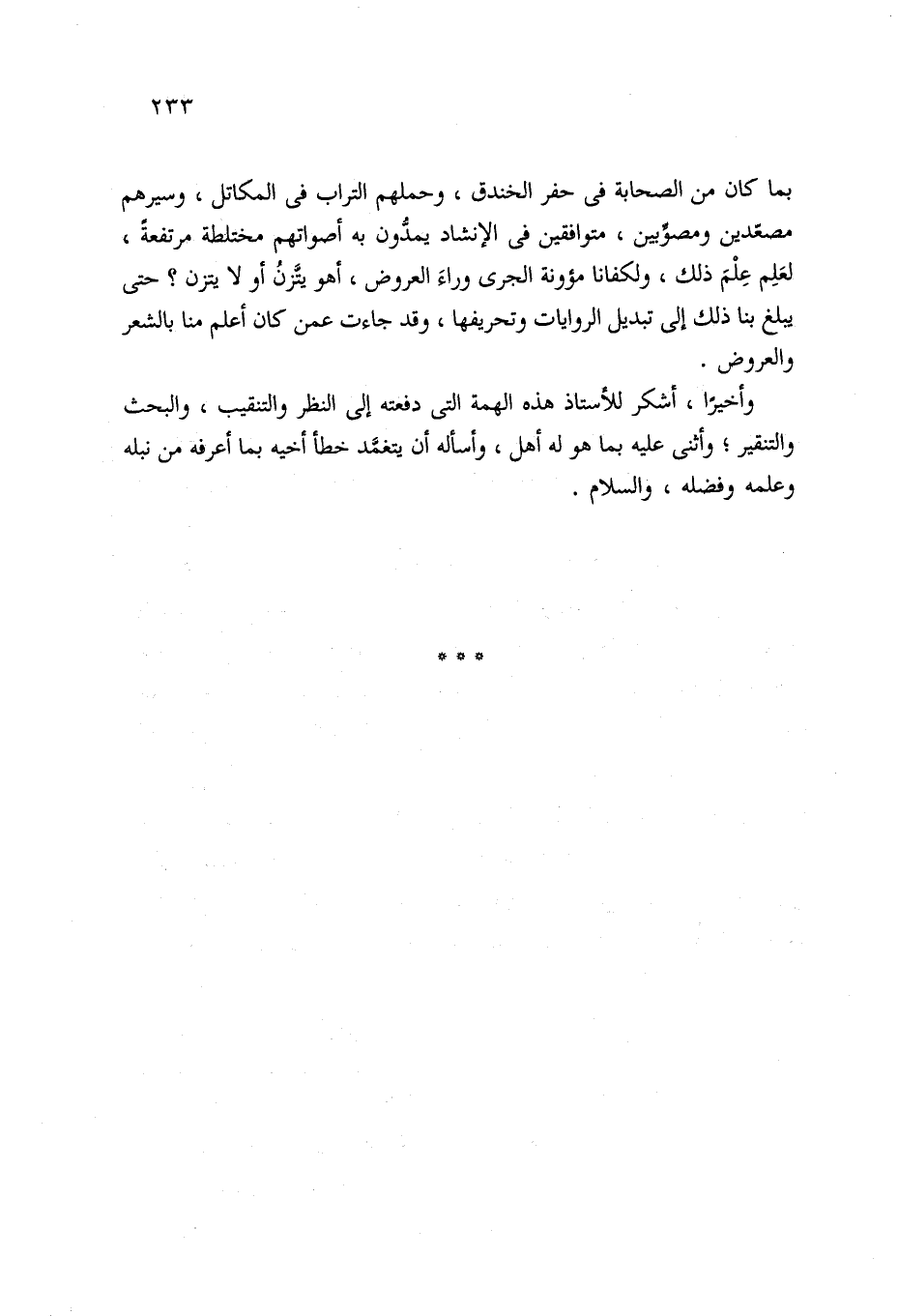بما كان من الصحابة في حفر الخندق، وحملهم التراب في المكاتل، وسيرهم مصعّدين ومصوِّبين، متوافقين في الإنشاد يمدُّون به أصواتهم مختلطة مرتفعةً، لعَلِم عِلْم ذلك، ولكفانا مؤونة الجرى وراءَ العروض، أهو يتَّزنُ أو لا يتزن؟ حتى يبلغ بنا ذلك إلى تبديل الروايات وتحريفها، وقد جاءت عمن كان أعلم منا بالشعر والعروض.