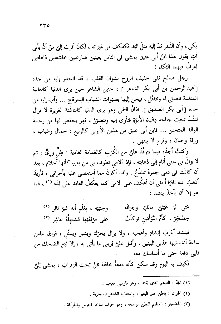بكى، وأن القَمَر مَدّ إليه مثلَ اليَد فكفكف من عَبَراته، لكانَ أقربَ إلي منْ أنْ يأتي آتٍ يقول هذا ابنُ أبي عتيق يمشي في الناس بعينين ضارعتين خاشعتين ذاهلتين يُعرفُ فيهما البُكاءَ!