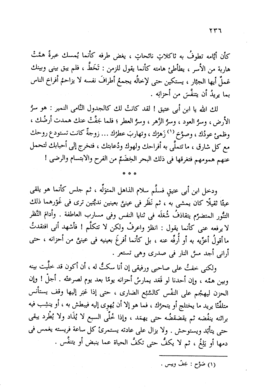 ودخل ابن أبي عتيقٍ فسلَّم سلام الذاهل المتوَلِّه، ثم جلس كأنما هو يلقى عبئًا ثقيلًا كان يمشي به، ثم نَظَر في عينيَّ بعينين نديَّتين ترى في غَوْرهما ذلك التنُّور المتضرِّم يتقاذفُ شُعَلَه في ثنايا النفس وفي مسارب العاطفة. وأدامَ النَّظر لا يرفعه عني كأنما يقول: انظر واعرفْ ولكن لا تتكلَّم! فأشهد أني افتقدتُ ما أقولُ أعزِّيه به أو أُرفِّه عنه، بل كأنما أفرغَ بعينيه في عينيَّ من أحزانه، حتى أراني أجد مسَّ النار في صدري وهي تستعر.