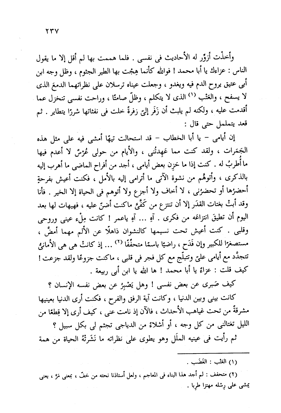 وأخذْت أزوِّر له الأحاديث في نفسي. فلما هممت بها لم أقل إلا ما يقول الناس: عزاءك يا أبا محمد! فوالله كأنما هِجْت بها الطير الجثوم، وظل وجه ابن أبي عتيق يروح الدم فيه ويغدو، وجعلت عيناه ترسلان على نظراتهما الدمعَ الذي لا يسفح، والعَتْب (¬1) الذي لا يتكلم، وظلّ صامتًا، وراحت نفسي تنخزل عما أقدمت عليه، ولكنه لم يلبث أن زَفَر إليّ زفرةً خلت في نفثاتها شررًا يتطاير. ثم قعد يتململ حتى قال: