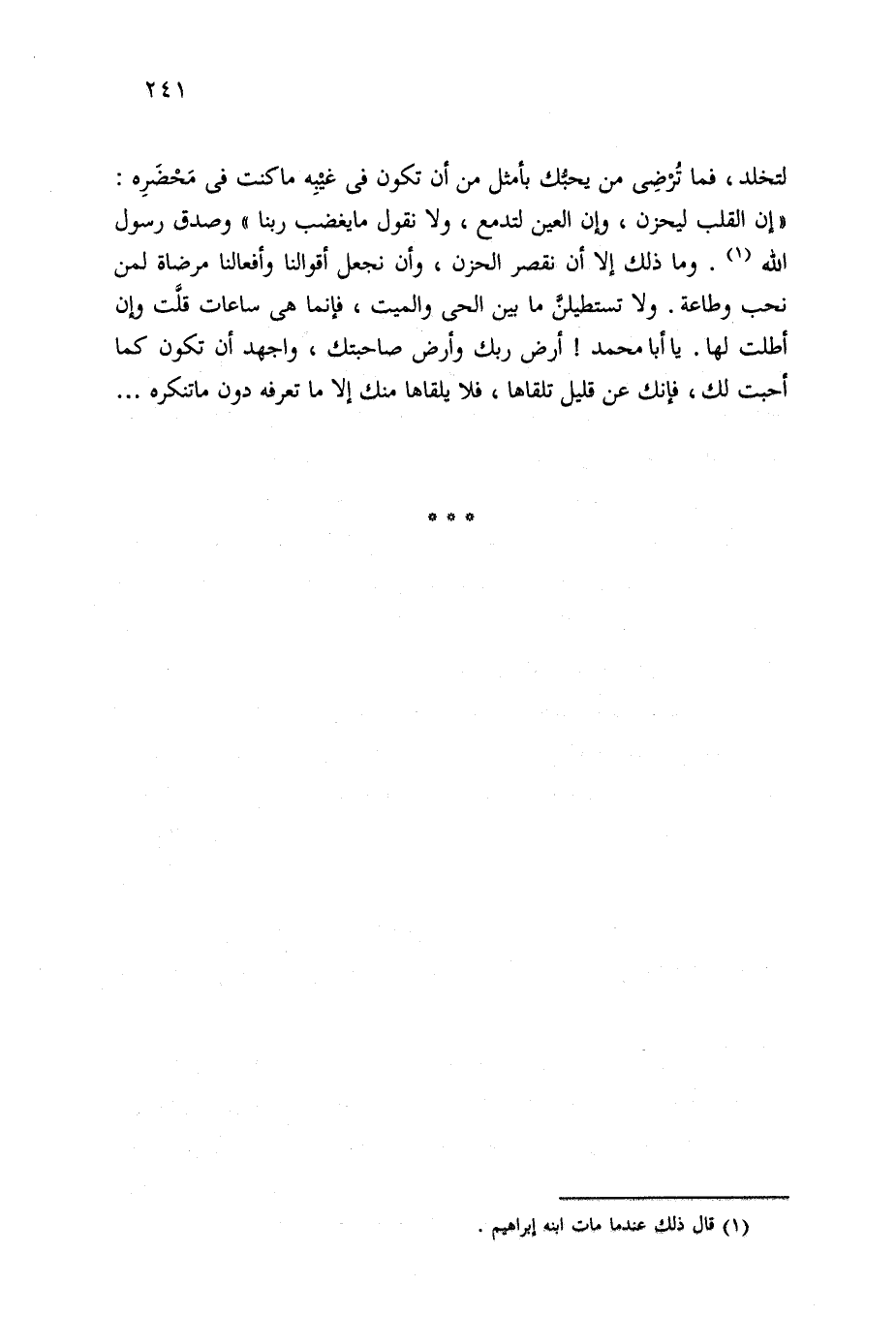لتخلد، فما تُرضِي من يحبك بأمثل من أن تكون في غيْبِه ما كنت في مَحْضَرِه: "إِن القلب ليحزن، وإن العين لتدمع، ولا نقول ما يغضب ربنا" وصدق رسول الله (¬1). وما ذلك إلا أن نقصر الحزن، وأن نجعل أقوالنا وأفعالنا مرضاة لمن نحب وطاعة. ولا تستطيلنَّ ما بين الحي والميت، فإنما هي ساعات قلَّت وإن أطلت لها. يا أبا محمد! أرض ربك وأرض صاحبتك، واجهد أن تكون كما أحبت لك، فإنك عن قليل تلقاها، فلا يلقاها منك إلا ما تعرفه دون ما تنكره. . .