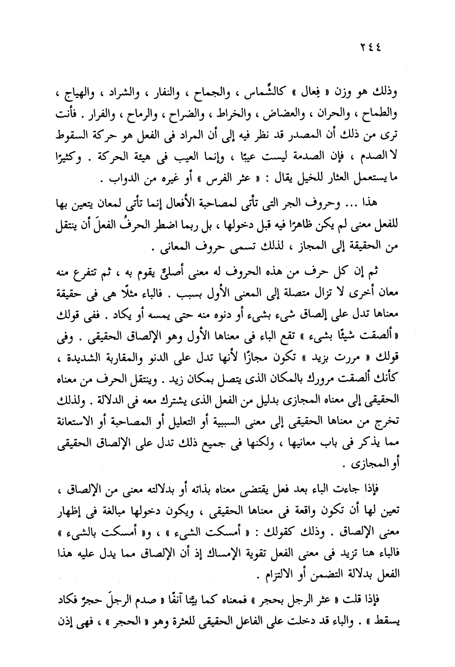 وذلك هو وزن "فِعال" كالشِّماس، والجماح، والنفار، والشراد، والهياج، والطماح، والحران، والعضاض، والخراط، والضراح، والرماح، والفرار. فأنت ترى من ذلك أن المصدر قد نظر فيه إلى أن المراد في الفعل هو حركة السقوط لا الصدم، فإن الصدمة ليست عيبًا، وإنما العيب في هيئة الحركة. وكثيرًا ما يستعمل العثار للخيل يقال: "عثر الفرس" أو غيره من الدواب.