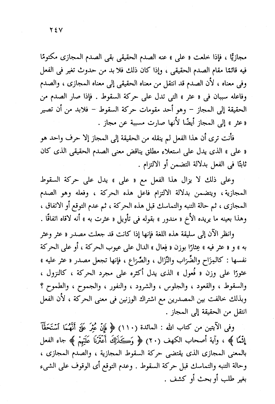 وعلى ذلك لا يزال هذا الفعل مع "على" يدل على حركة السقوط المجازية، ويتضمن بدلالة الالتزام فاعل هذه الحركة، وفعله وهو الصدم المجازي، ثم حالة التنبه والتماسك قبل هذه الحركة، ثم عدم التوقع أو الاتفاق، وهذا بعينه ما يريده الأخ "مندور" بقوله في تأويل "عثرت به" أنه لاقاه اتفاقًا.