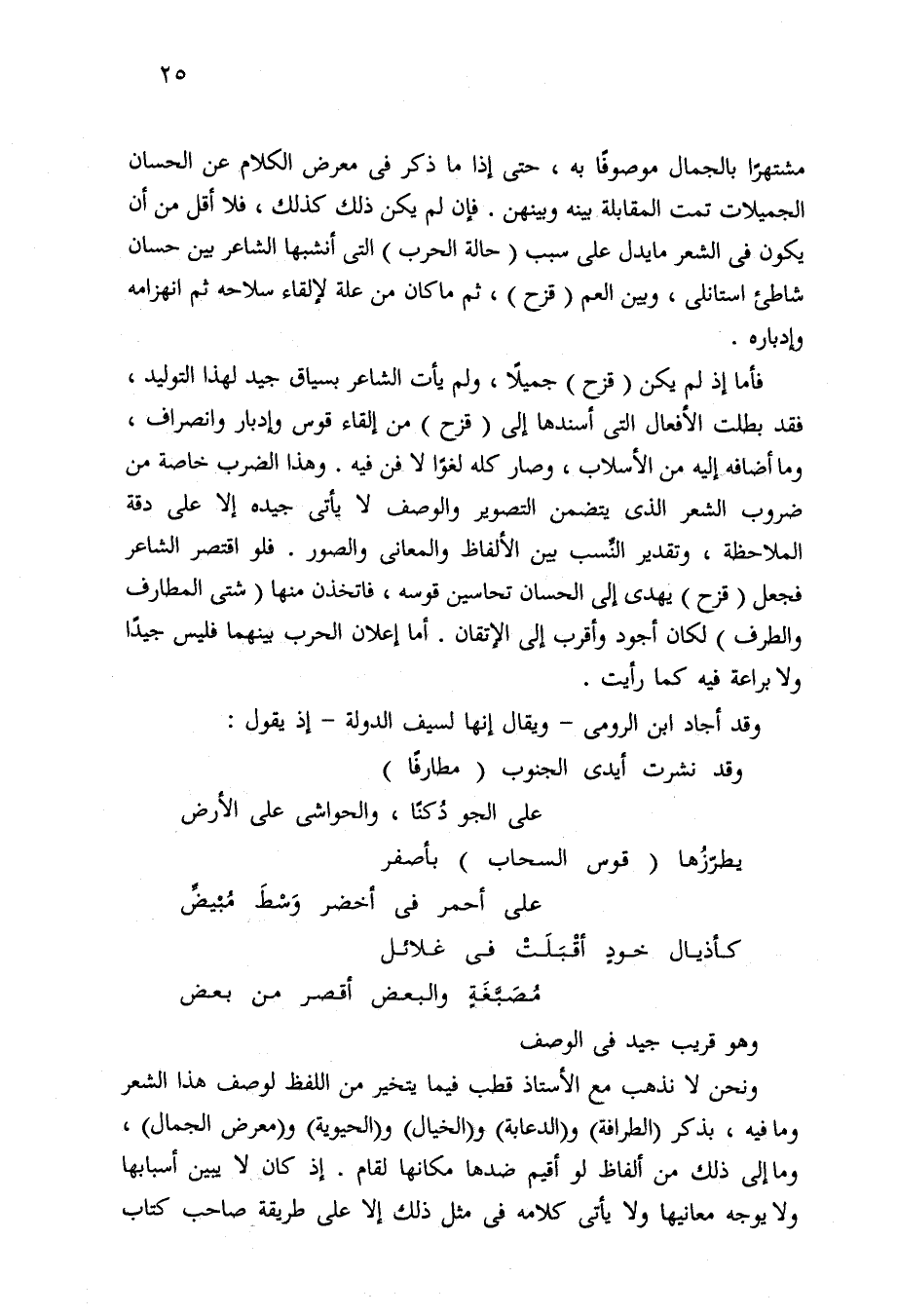 فأما إذ لم يكن (قزح) جميلًا، ولم يأت الشاعر بسياق جيد لهذا التوليد، فقد بطلت الأفعال التي أسندها إلى (قزح) من إلقاء قوس وإدبار وانصراف، وما أضافه إليه من الأسلاب، وصار كله لغوًا لا فن فيه. وهذا الضرب خاصة من ضروب الشعر الذي يتضمن التصوير والوصف لا يأتي جيده إلا على دقة الملاحظة، وتقدير النِّسب بين الألفاظ والمعاني والصور. فلو اقتصر الشاعر فجعل (قزح) يهدى إلى الحسان تحاسين قوسه، فاتخذن منها (شتى المطارف والطرف) لكان أجود وأقرب الى الإتقان. أما إعلان الحرب بينهما فليس جيدًا ولا براعة فيه كما رأيت.