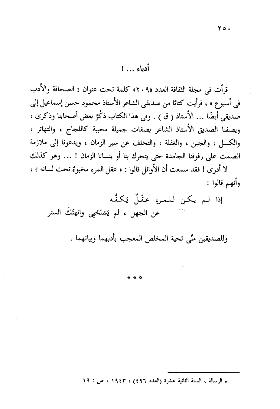 (*) الرسالة، السنة الثانية عشرة (العدد 496)، 1943، ص: 19