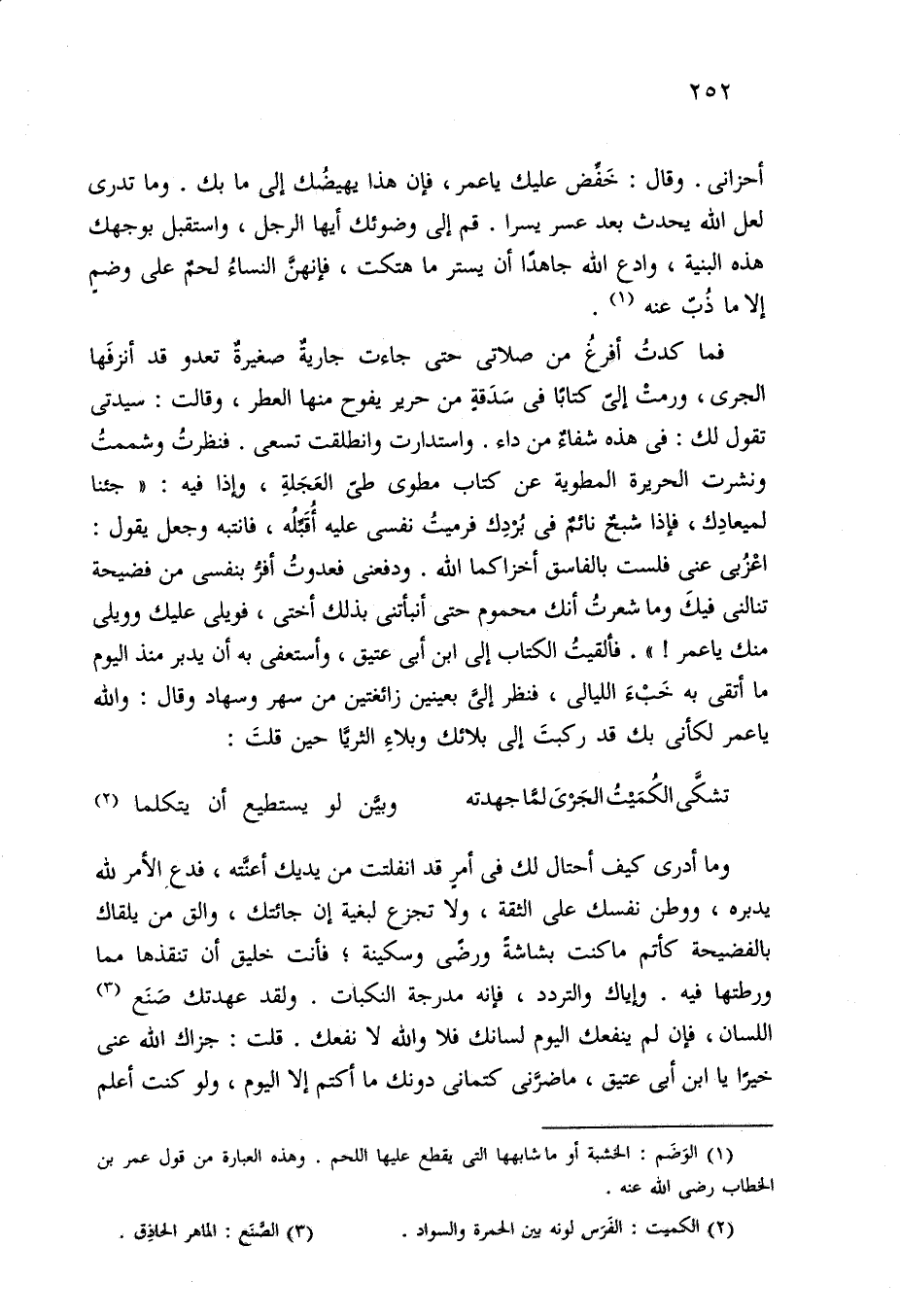 أحزاني. وقال: خَفِّض عليك يا عمر، فإن هذا يهيضُك إلى ما بك. وما تدري لعل الله يحدث بعد عسر يسرا. قم إلى وضوئك أيها الرجل، واستقبل بوجهك هذه البنية، وادع الله جاهدًا أن يستر ما هتكت، فإنهنَّ النساءُ لحمٌ على وضمٍ إلاما ذُبّ عنه (¬1).