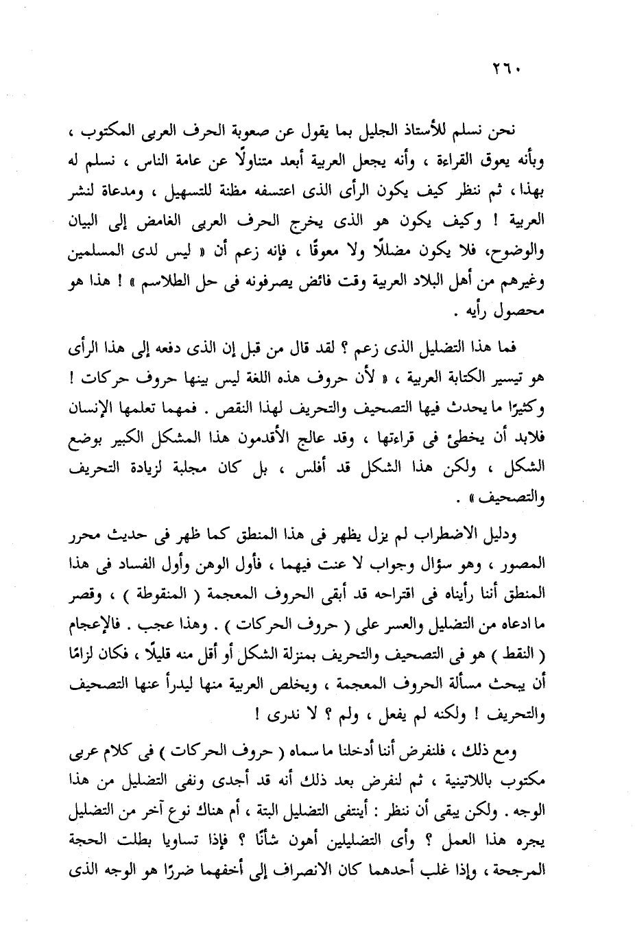 ومع ذلك، فلنفرض أننا أدخلنا ما سماه (حروف الحركات) في كلام عربي مكتوب باللاتينية، ثم لنفرض بعد ذلك أنه قد أجدى ونفى التضليل من هذا الوجه. ولكن يبقى أن ننظر: أينتفي التضليل البتة، أم هناك نوع آخر من التضليل يجره هذا العمل؟ وأي التضليلين أهون شأنًا؟ فإذا تساويا بطلت الحجة المرجحة، وإذا غلب أحدهما كان الانصراف إلى أخفهما ضررًا هو الوجه الذي