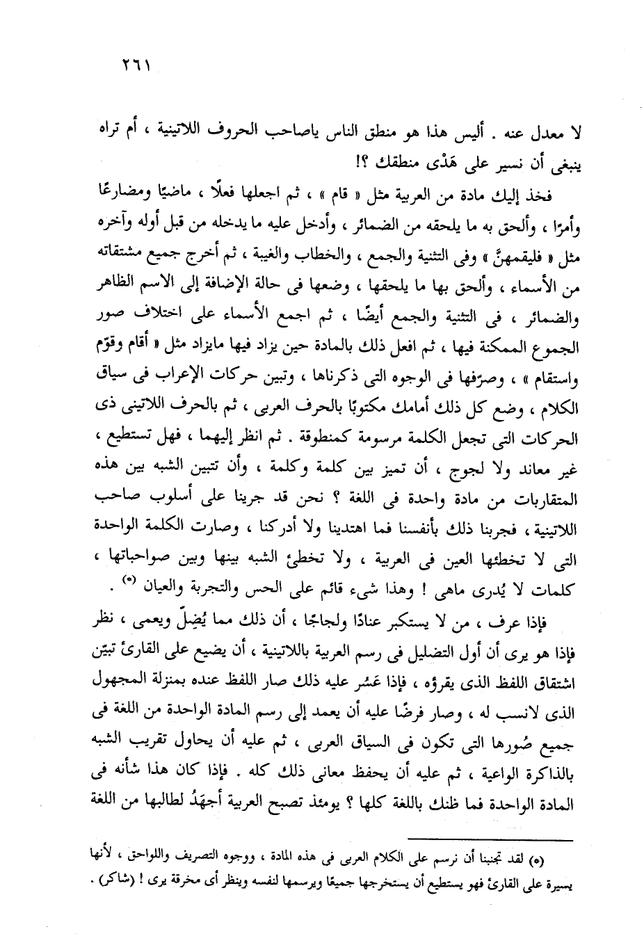 فخذ إليك مادة من العربية مثل "قام"، ثم اجعلها فعلًا، ماضيًا ومضارعًا وأمرًا، وألحق به ما يلحقه من الضمائر، وأدخل عليه ما يدخله من قبل أوله وآخره مثل "فليقمهنَّ" وفي التثنية والجمع، والخطاب والغيبة، ثم أخرج جميع مشتقاته من الأسماء، وألحق بها ما يلحقها، وضعها في حالة الإضافة إلى الاسم الظاهر والضمائر، في التثنية والجمع أيضا، ثم أجمع الأسماء على اختلاف صور الجموع الممكنة فيها، ثم افعل ذلك بالمادة حين يزاد فيها ما يزاد مثل "أقام وقوّم واستقام"، وصرّفها في الوجوه التي ذكرناها، وتبين حركات الإعراب في سياق الكلام، وضع كل ذلك أمامك مكتوبًا بالحرف العربي، ثم بالحرف اللاتيني ذي الحركات التي تجعل الكلمة مرسومة كمنطوقة، ثم انظر إليهما، فهل تستطيع، غير معاند ولا لجوج، أن تميز بين كلمة وكلمة، وأن تتبين الشبه بين هذه المتقاربات من مادة واحدة في اللغة؟ نحن قد جرينا على أسلوب صاحب اللاتينية، فجربنا ذلك بأنفسنا فما اهتدينا ولا أدركنا، وصارت الكلمة الواحدة التي لا تخطئها العين في العربية، ولا تخطئ الشبه بينها وبين صواحباتها، كلمات لا يُدرى ما هي! وهذا شيء قائم على الحس والتجربة والعيان (*).