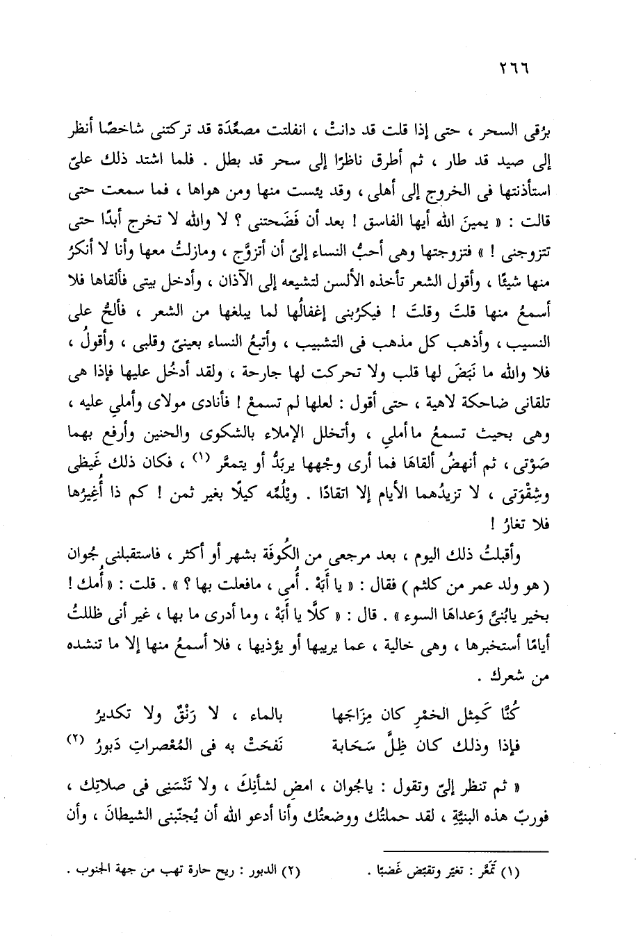 وأقبلتُ ذلك اليوم، بعد مرجعي من الكُوفَة بشهر أو أكثر، فاستقبلني جُوان (هو ولد عمر من كلثم) فقال: "يا أَبَهْ. أُمي، ما فعلت بها؟ ". قلت: "أُمك! بخير يا بُني وَعداهَا السوء". قال: "كلاَّ يا أَبَهْ، وما أدري ما بها، غير أني ظللتُ أيامًا أستخبرها، وهي خالية، عما يريبها أو يؤذيها، فلا أسمعُ منها إلا ما تنشده من شعرك.