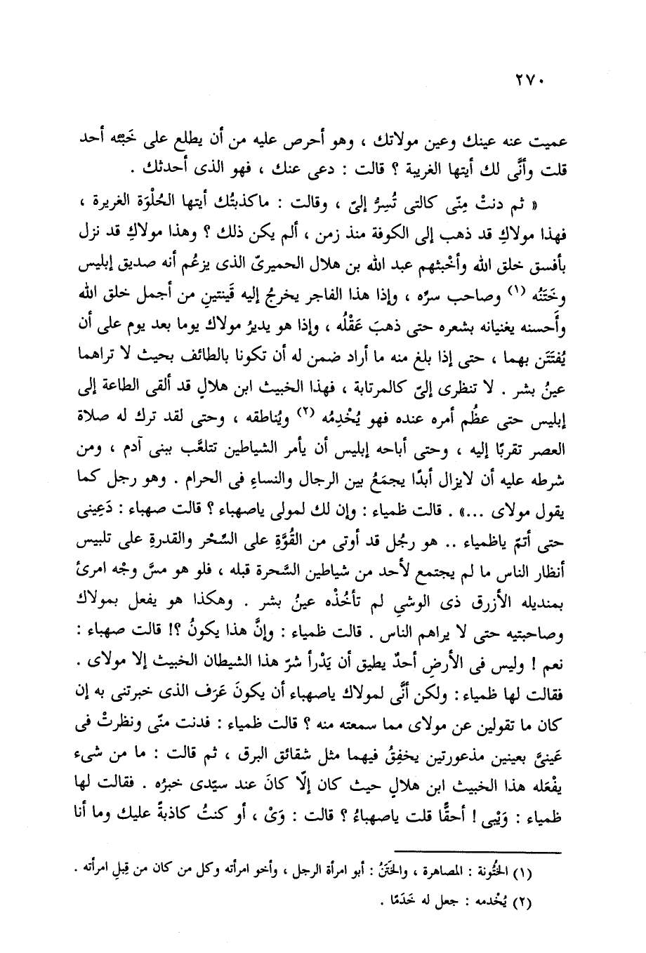 "ثم دنتْ مِني كالتي تُسِرُّ إليّ، وقالت: ما كذبتُك أيتها الحُلْوَة الغريرة، فهذا مولاكِ قد ذهب إلى الكوفة منذ زمن، ألم يكن ذلك؟ وهذا مولاكِ قد نزل بأفسق خلق الله وأخْبثهم عبد الله بن هلال الحميريّ الذي يزعُم أنه صديق إبليس وخَتَنُه (¬1) وصاحب سرَّه، وإذا هذا الفاجر يخرجُ إليه قَينتين من أجمل خلق الله وأَحسنه يغنيانه بشعره حتى ذهبَ عَقْلُه، وإذا هو يديرُ مولاك يومًا بعد يوم على أن يُفتَتَن بهما، حتى إذا بلغ منه ما أراد ضمن له أن تكونا بالطائف بحيث لا تراهما عينُ بشر. لا تنظري إليّ كالمرتابة، فهذا الخبيث ابن هلالٍ قد ألقى الطاعة إلى إبليس حتى عظُم أمره عنده فهو يُخْدِمُه (¬2) ويُناطقه، وحتى لقد ترك له صلاة العصر تقربًا إليه، وحتى أباحه إبليس أن يأمر الشياطين تتلعَّب ببني آدم، ومن شرطه عليه أن لا يزال أبدًا يجمَعُ بين الرجال والنساءِ في الحرام. وهو رجل كما يقول مولاي. . . .". قالت ظمياء: وإن لك لمولى يا صهباء؟ قالت صهباء: دَعيني حتى أتمّ يا ظمياء .. هو رجُل قد أوتى من القُوَّةِ على السِّحْر والقدرةِ على تلبيس أنظار الناس ما لم يجتمع لأحد من شياطين السَّحرة قبله، فلو هو مسَّ وجْه امرئ بمنديله الأزرق ذي الوشي لم تأخُذْه عينُ بشر. وهكذا هو يفعل بمولاك وصاحبتيه حتى لا يراهم الناس. قالت ظمياء: وإنَّ هذا يكونُ؟ ! قالت صهباء: نعم! وليس في الأرضِ أحدٌ يطيق أن يَدْرأ شرّ هذا الشيطان الخبيث إلا مولاي. فقالت لها ظمياء: ولكن أنَّى لمولاك يا صهباء أن يكونَ عَرَف الذي خبرتني به إن كان ما تقولين عن مولاي مما سمعته منه؟ قالت ظمياء: فدنت مني ونظرتْ في عَيني بعينين مذعورتين يخفِقُ فيهما مثل شقائق البرق، ثم قالت: ما من شيء يفْعَله هذا الخبيث ابن هلالٍ حيث كان إلا كانَ عند سيّدى خبرُه. فقالت لها ظمياء: وَيْبى! أحقا قلت يا صهباءُ؟ قالت: وَىْ، أو كنتُ كاذبة عليك وما أنا