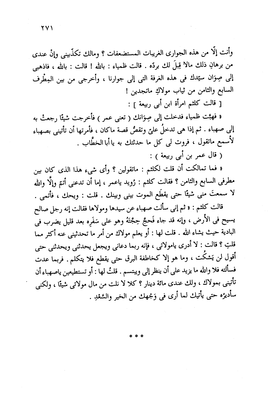 "فما تمالكت أن قلت لكلثم: ما تقولين؟ وأي شيء هذا الذي كان بين مطرفي السابع والثامن؟ فقالت كلثم: رُويد يا عمر، إما أن تدعني أتمّ وإلَّا والله لا سمعتَ مني شيئًا حتى يقطَع الموت بيني وبينك. قلت: ويحك، فأتمي.