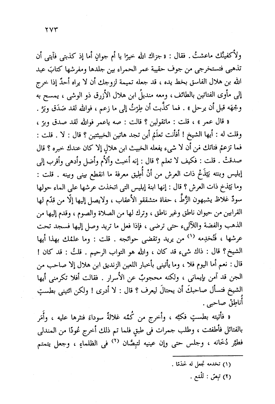 "قال عمر"، قلت: ما تقولين؟ قالت: صه يا عمر فوالله لقد صدق وبرّ، وقلت له: أيها الشيخ! أفأنت تعلَمُ أين تجد هاتين الخبيثتين؟ قال: لا. قلت: فما تزعمُ فتاتك من أن لا شيء يفعله الخبيث ابن هلالٍ إلا كان عندك خبره؟ قال صدقتْ. قلت: فكيف لا تعلم؟ قال: إنه أخبث وألأم وأضل وأدهى وأقرب إلى إبليس وبنته بَيْذَخْ ذات العرش من أنْ أُطِيق معرفة ما انقطع بيني وبينه. قلت: وما بيذخ ذات العرش؟ قال: إنها ابنة إبليس التي اتخذت عرشها على الماء حولها سودٌ غلاظ يشبهون الزُّطَّ، حفاة متشققو الأعقاب، ولا يصل إليها إلّا من قدّم لها القرابين من حيوان ناطق وغير ناطق، وترك لها من الصلاة والصوم، وقدم إليها من الذهب والفضة واللآلئ حتى ترضى، فإذا فعل ما تريد وصل إليها فسجد تحت عرشها، فَتُخدِمه (¬1) من يريد وتقضي حوائجه. قلت: وما علمك بهذا أيها الشيخ؟ قال: ذاك شيء قد كان، والله هو التواب الرحيم. قلتُ: قد كان! قال: نعم أما اليوم فلا، وما يأتيني بأخبار اللعين الزنديق ابن هلال إلا صاحب من الجن قد آمن بإيماني، ولكنه محجوبٌ عن الأسرار. فقالت أفلا تكرمني أيها الشيخ فتسأل صاحبكَ أن يحتالَ ليعرف؟ قال: لا أدري! ولكن ائتينى بطستٍ أُناطِقْ صاحبى.