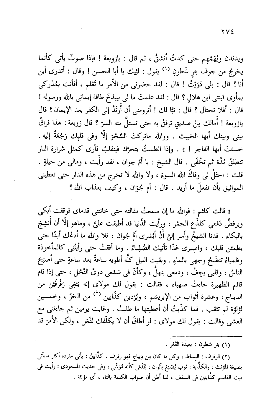 ويدندن ويُهَمْهِم حتى كدتُ أنشقُّ، ثم قال: يا زوبعة! فإذا صوت يأتي كأنما يخرجُ من جوف بئرٍ شَطون (¬1) يقول: لبَّيك يا أبا الحسن! وقال: أتدري أين أنا؟ قال: بلى دَرَيْتُ! قال: لقد حضرني من الأمر ما تَعْلم، أفأنت بمُدْركي بمأوى قينتي ابن هلالٍ؟ قال: لقد علمتَ ما لي ببيذخَ طاقة إيماني بالله ورسوله! قال: أفلا تحتال؟ قال: تبًّا لك! أترومني أن أَرتَدَّ إلى الكفر بعد الإيمان؟ قال يا زوبعة! أَمالك مِنْ صديق ترفقُ به حتى تستلَّ منه السرّ؟ قال زوبعة: هذا فراقُ بيني وبينك أيها الخبيث. ووالله ما تركتَ السِّحْرَ إلا وفي قلبِك رَجْعَة إليه. خسئتَ أيها الفاجر! ". وإذا الطستُ يتحرَّك فينقلبُ فأرى كمثل شرارة النار تنطلقُ مُدَّة ثم تخْفَى. قال الشيخ: يا أمّ جوان، لقد رأَيت، ومالي من حيلةٍ. قلت: احتَلْ لي وقاكَ الله السوءَ، ولا والله لا تخرج من هذه الدار حتى تعطيني المواثيق بأن تفعلَ ما أريد. قال: أم جُوَان، وكيف بعذاب الله؟