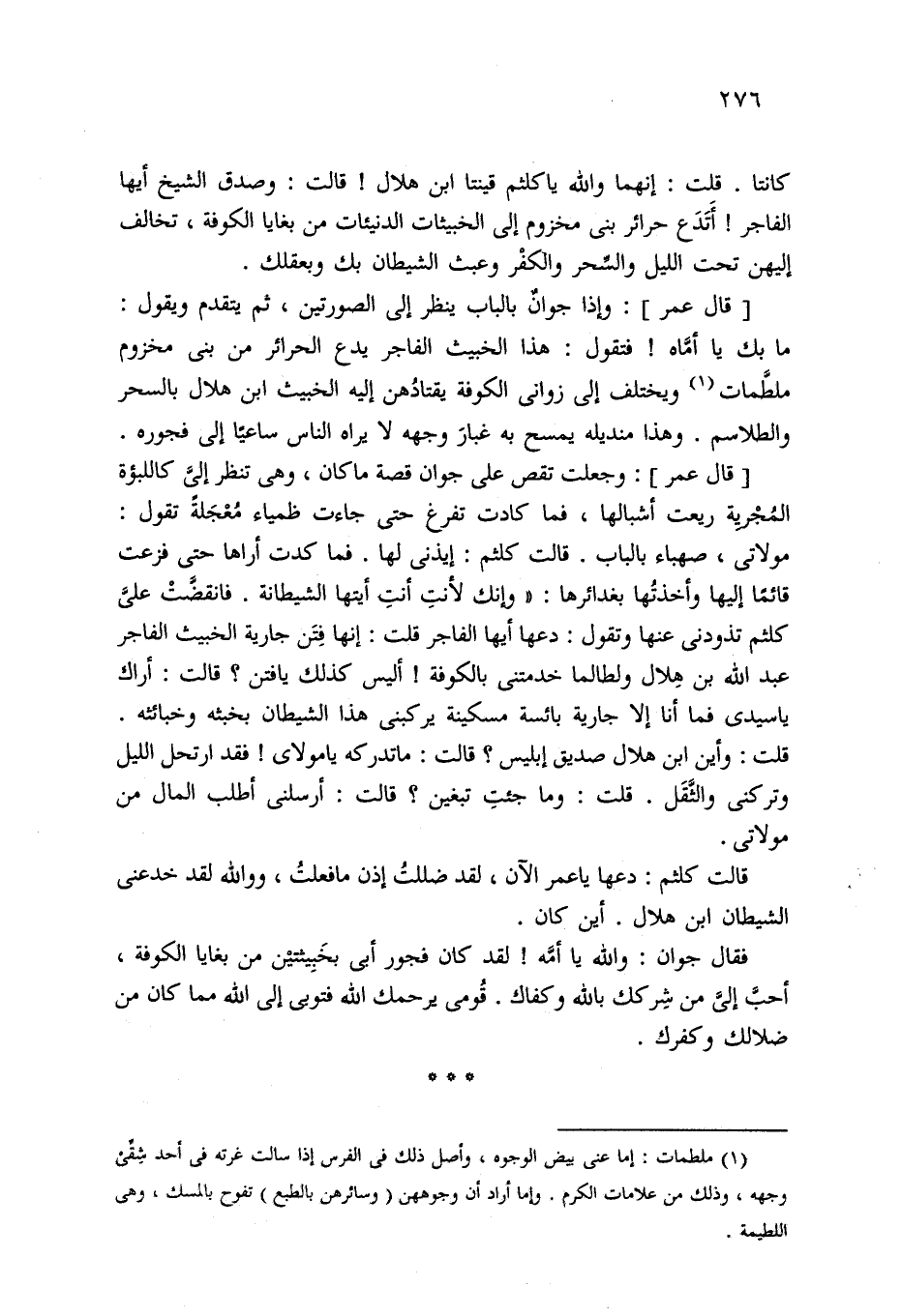 كانتا. قلت: إنهما والله يا كلثم قينتا ابن هلال! قالت: وصدق الشيخ أيها الفاجر! أَتَدَع حرائر بني مخزوم إلى الخبيثات الدنيئات من بغايا الكوفة، تخالف إليهن تحت الليل والسِّحر والكفْر وعبث الشيطان بك وبعقلك.