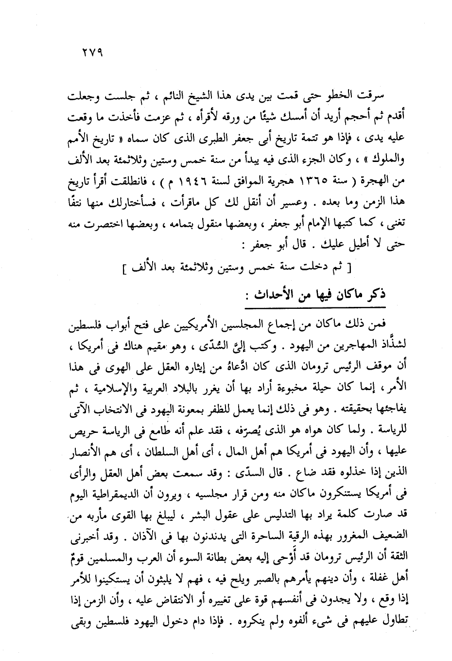 سرقت الخطو حتى قمت بين يدي هذا الشيخ النائم، ثم جلست وجعلت أقدم ثم أحجم أريد أن أمسك شيئًا من ورقه لأقرأه، ثم عزمت فأخذت ما وقعت عليه يدي، فإذا هو تتمة تاريخ أبي جعفر الطبري الذي كان سماه "تاريخ الأمم والملوك"، وكان الجزء الذي فيه يبدأ من سنة خمس وستين وثلاثمئة بعد الألف من الهجرة (سنة 1365 هجرية الموافق لسنة 1946 م)، فانطلقت أقرأ تاريخ هذا الزمن وما بعده. وعسير أن أنقل لك كل ما قرأت، فسأختار لك منها نتفًا تغنى، كما كتبها الإمام أبو جعفر، وبعضها منقول بتمامه، وبعضها اختصرت منه حتى لا أطيل عليك. قال أبو جعفر:
