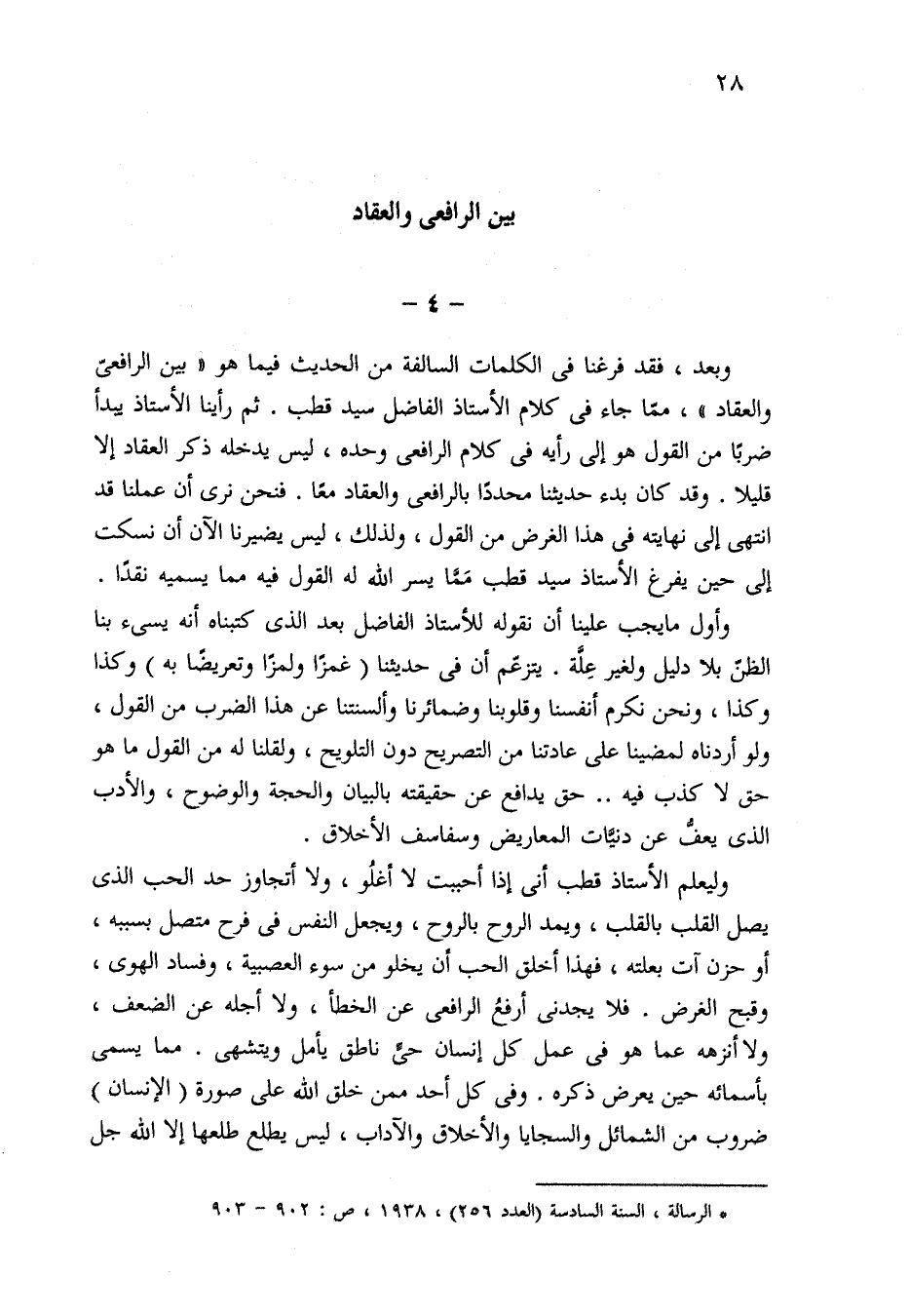 وليعلم الأستاذ قطب أني إذا أحببت لا أغلُو، ولا أتجاوز حد الحب الذي يصل القلب بالقلب، ويمد الروح بالروح، ويجعل النفس في فرح متصل بسببه، أو حزن آت بعلته، فهذا أخلق الحب أن يخلو من سوء العصبية، وفساد الهوى، وقبح الغرض. فلا يجدني أرفعُ الرافعي عن الخطأ، ولا أجله عن الضعف، ولا أنزهه عما هو في عمل كل إنسان حي ناطق يأمل ويتشهي. مما يسمى بأسمائه حين يعرض ذكره. وفي كل أحد ممن خلق الله على صورة (الإنسان) ضروبه من الشمائل والسجايا والأخلاق والآداب، ليس يطلع طلعها إلا الله -جل